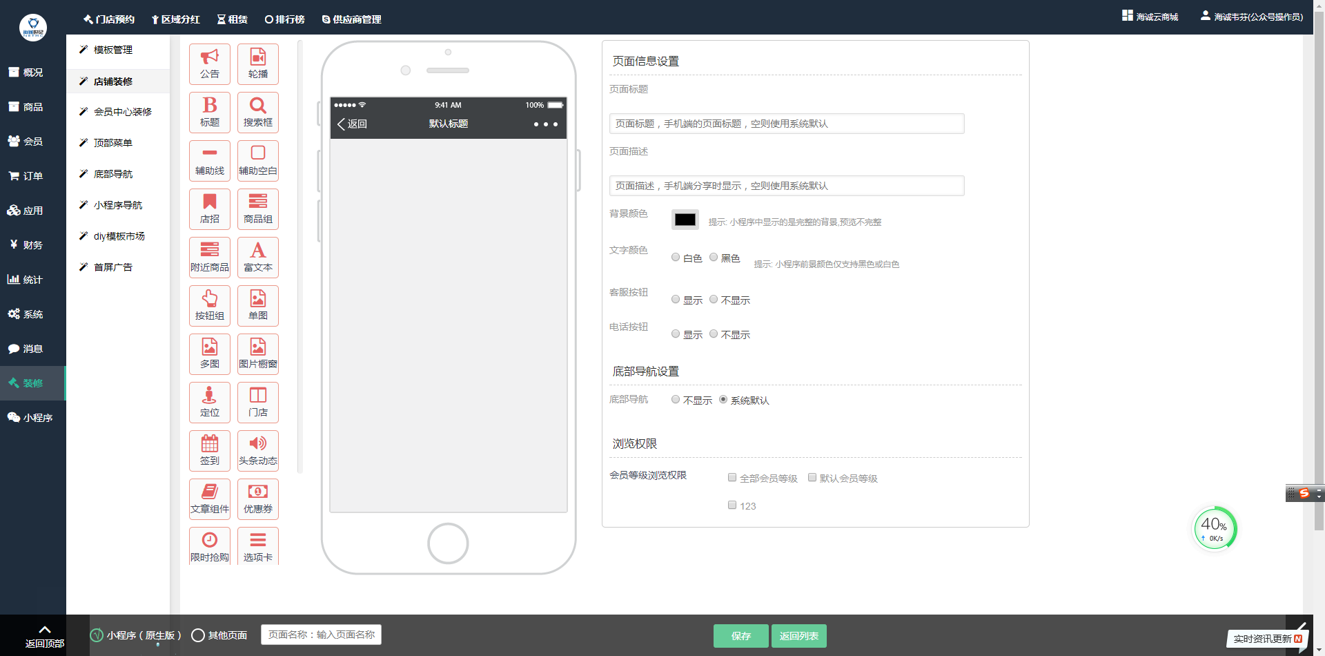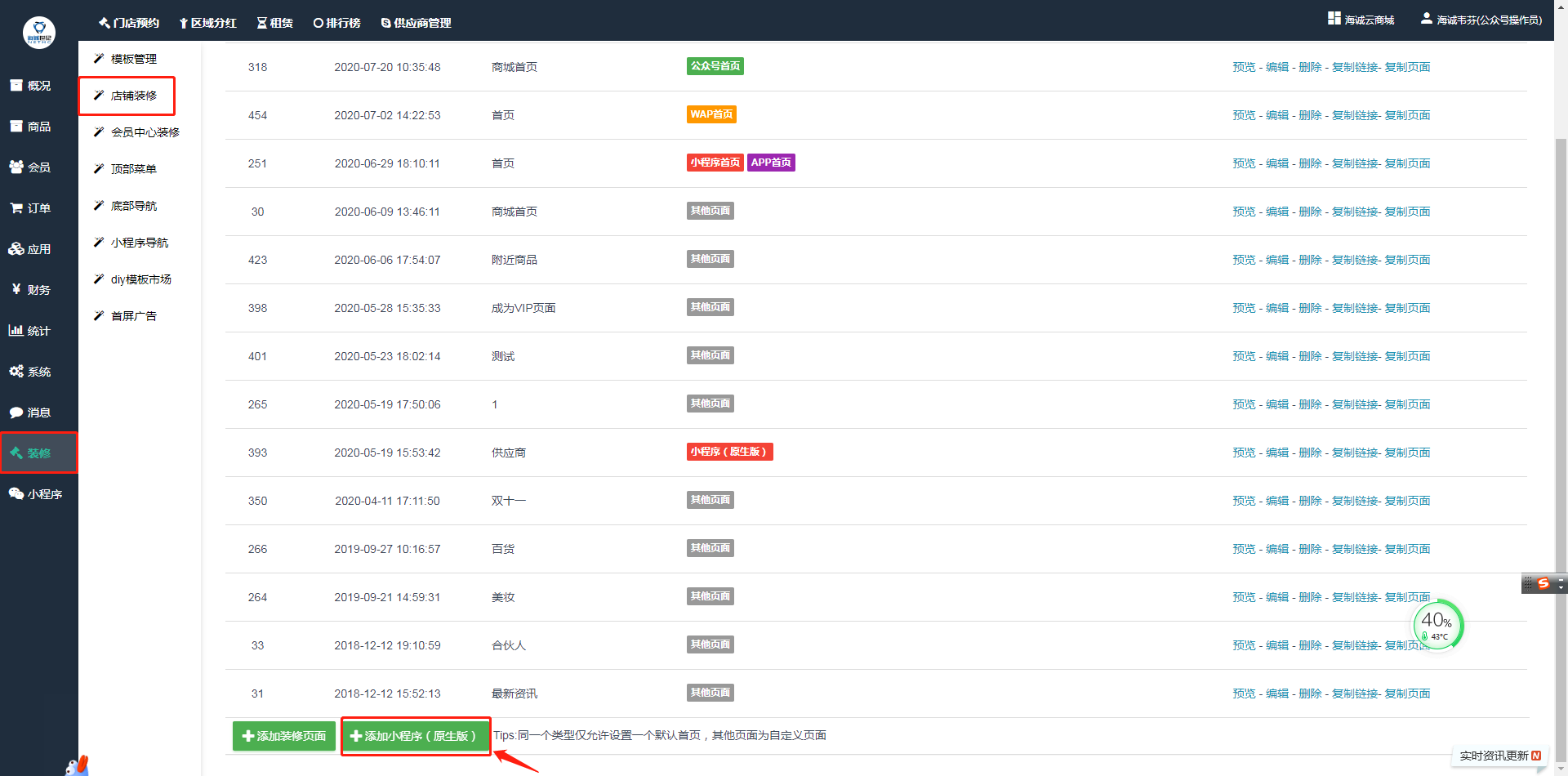 ### 1、审核/发布小程序前请务必在**应用–工具类–店铺装修–小程序**添加**原生小程序**装修页面,在商城后台填写好小程序基本信息并开启。