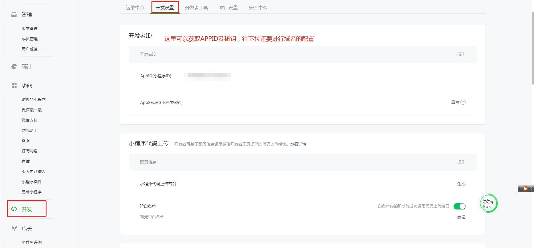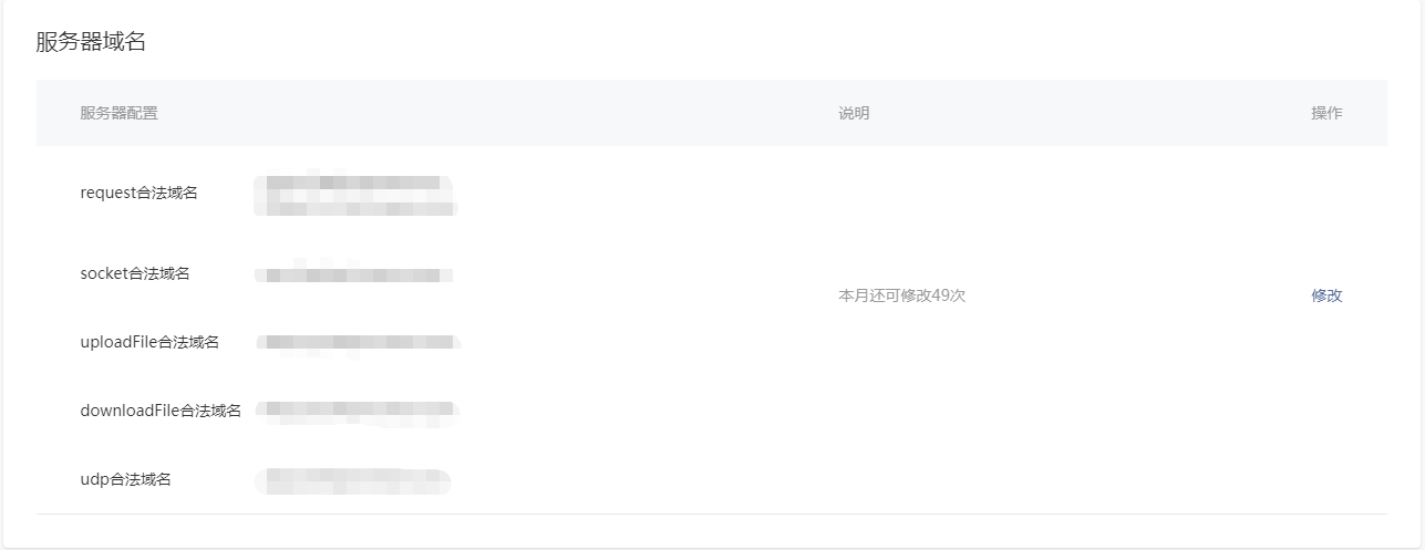 ### 小程序平台配置服务器域名操作步骤:首先登录**小程序官方后台**(网址:mp.weixin.qq.com),在左侧菜单 **开发 — 开发设置 — 服务器域名**中 填写您的后台域名,如下图: