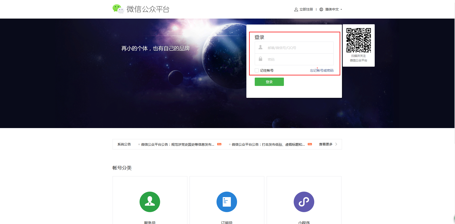 ## 1、公众号申请认证完成之后就会出现公众号的所有功能以及相应的接口,登录微信公众号,输入账号密码,公众号管理员扫码后即可登录
