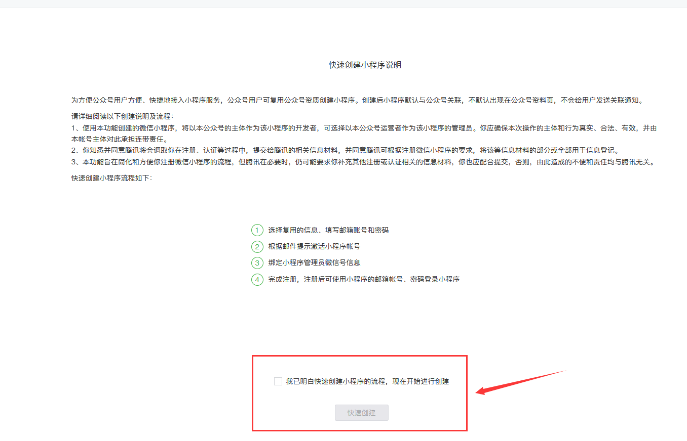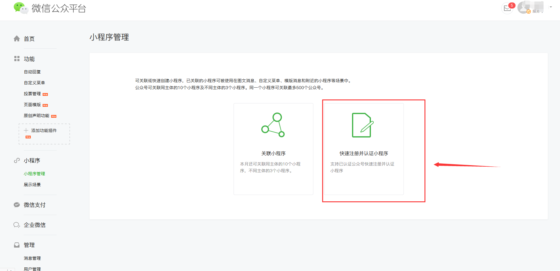 ## 2、登录之后,找到小程序按钮“**快速认证小程序**”这样就直接复制公众号时填写的资料进行复制认证,