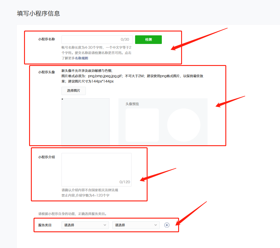 ## 8、填写小程序信息,填写**名称、上传头像、填写小程序介绍、选择服务类目**
