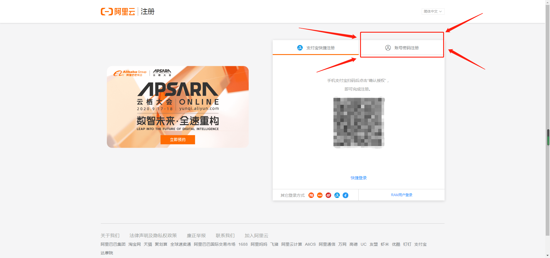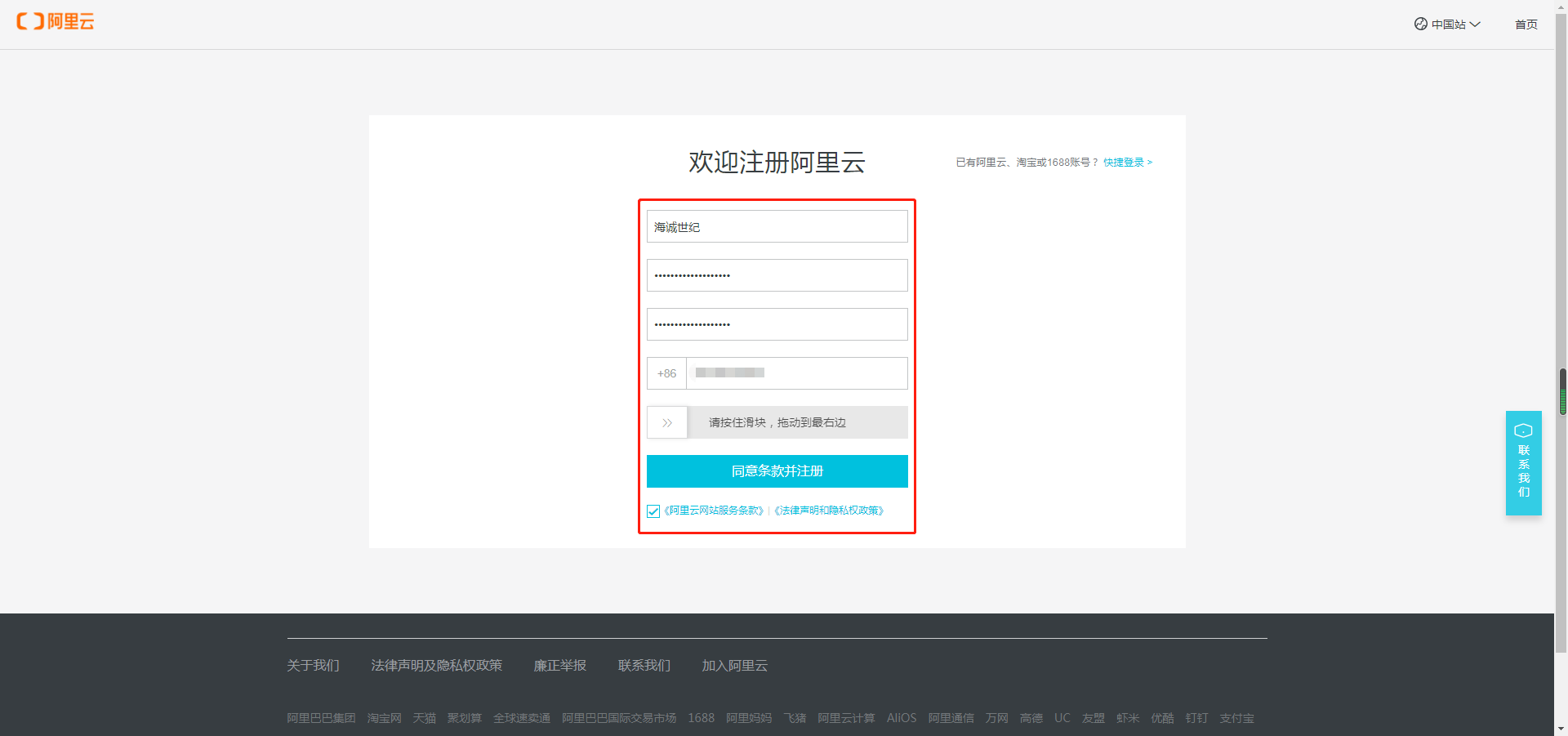 ## 三、输入注册账号和密码,然后勾选阿里云网址服务条款并点击同意。