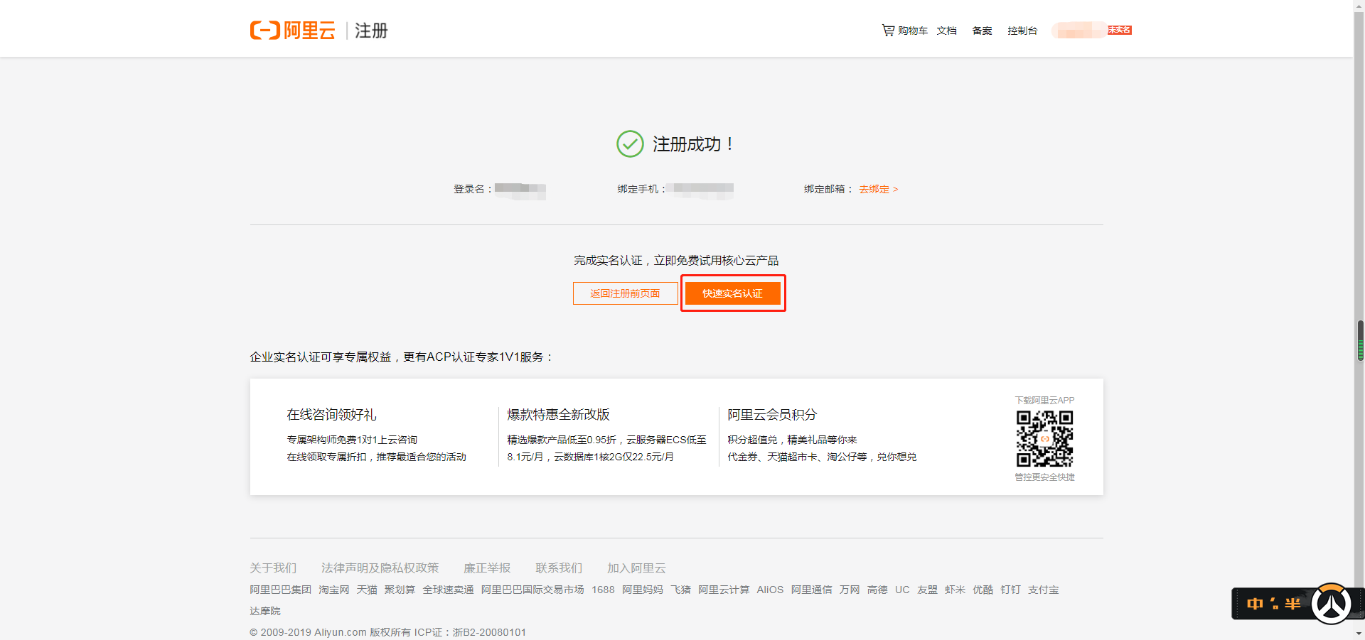 ## 五、注册成功!**[点击快速认证](https://www.kancloud.cn/hcnet/hc20/1740352)。**