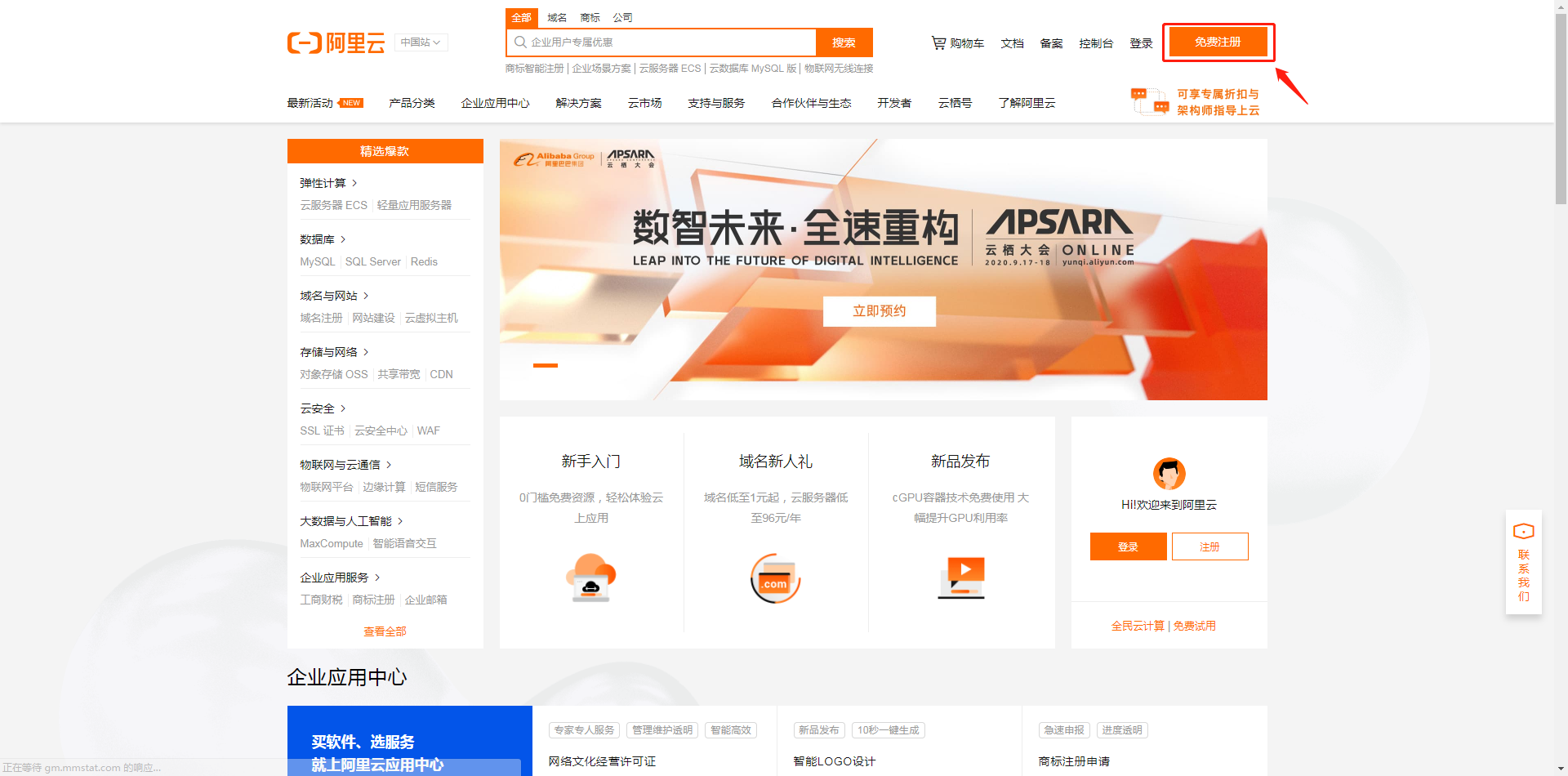 ## 1、打开阿里云首页,**[点击此处可进入首页](http://www.aliyun.com/)**。