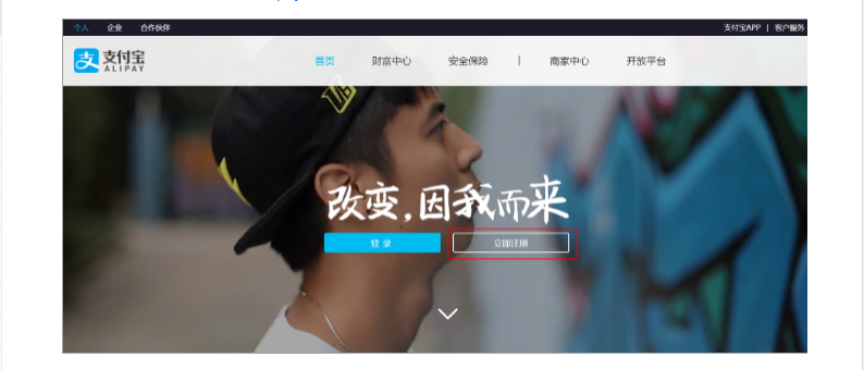 ## 1、打开支付宝官网[(https://www.alipay.com/)] ,点击【**立即注册**】