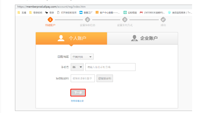 ## 3、点击同意后【**个人账户**】;默认选择【**中国大陆**】,输入手机号码和验证码,点击【**下一步**】,如校验码一直没有收到,可以点击【**重新获取短信**】