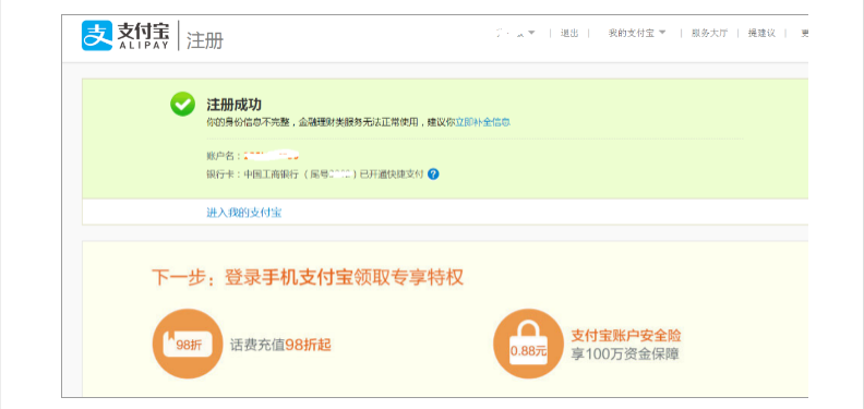 >[danger]## **温馨提示** :部分账户注册成功后,该登录名可在:支付宝、天猫、淘宝、聚划算、一淘、阿里巴巴国际站、阿里巴巴中文站、阿里云网上通用,且登录密码与支付宝登录密码一致
