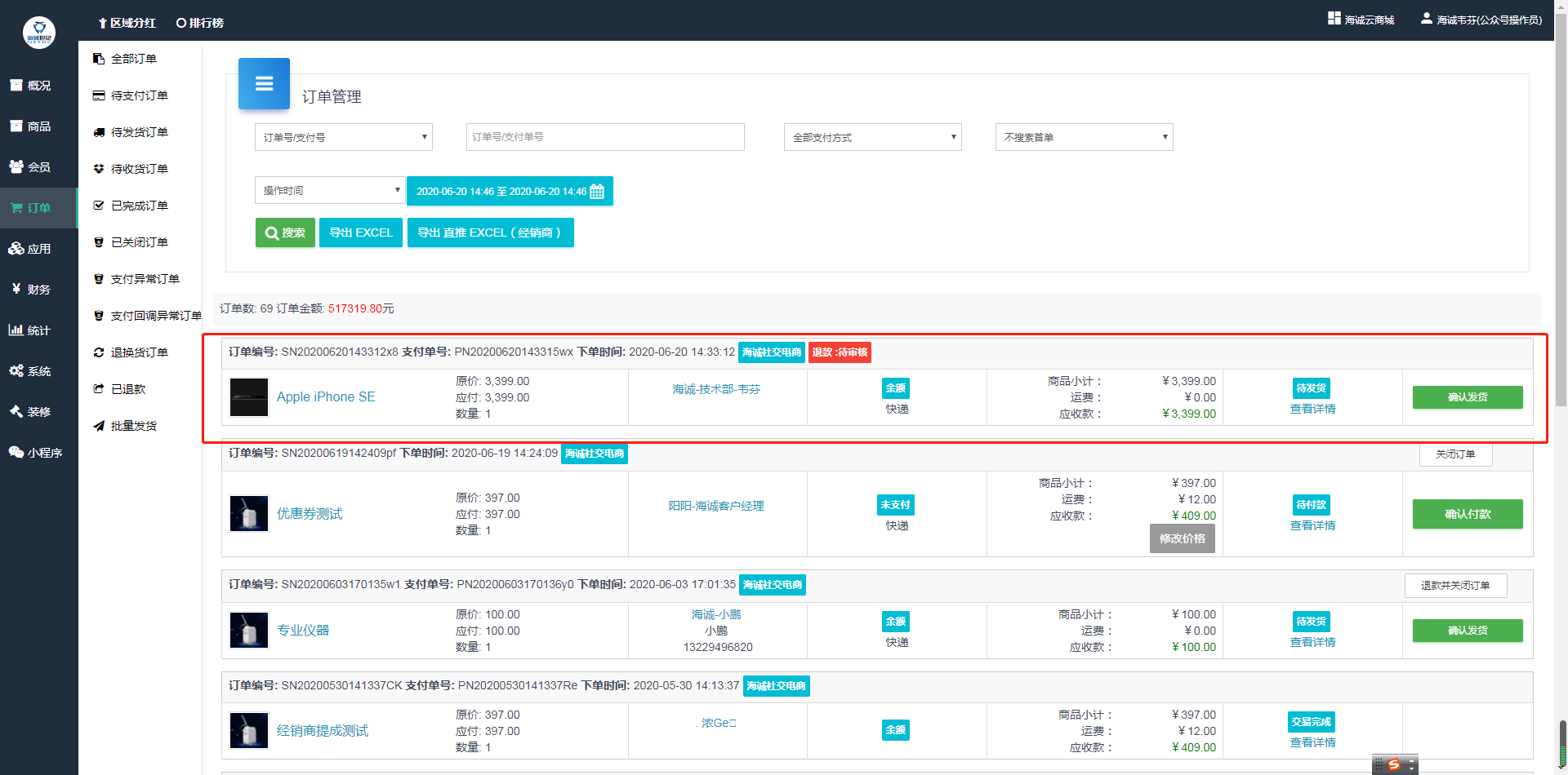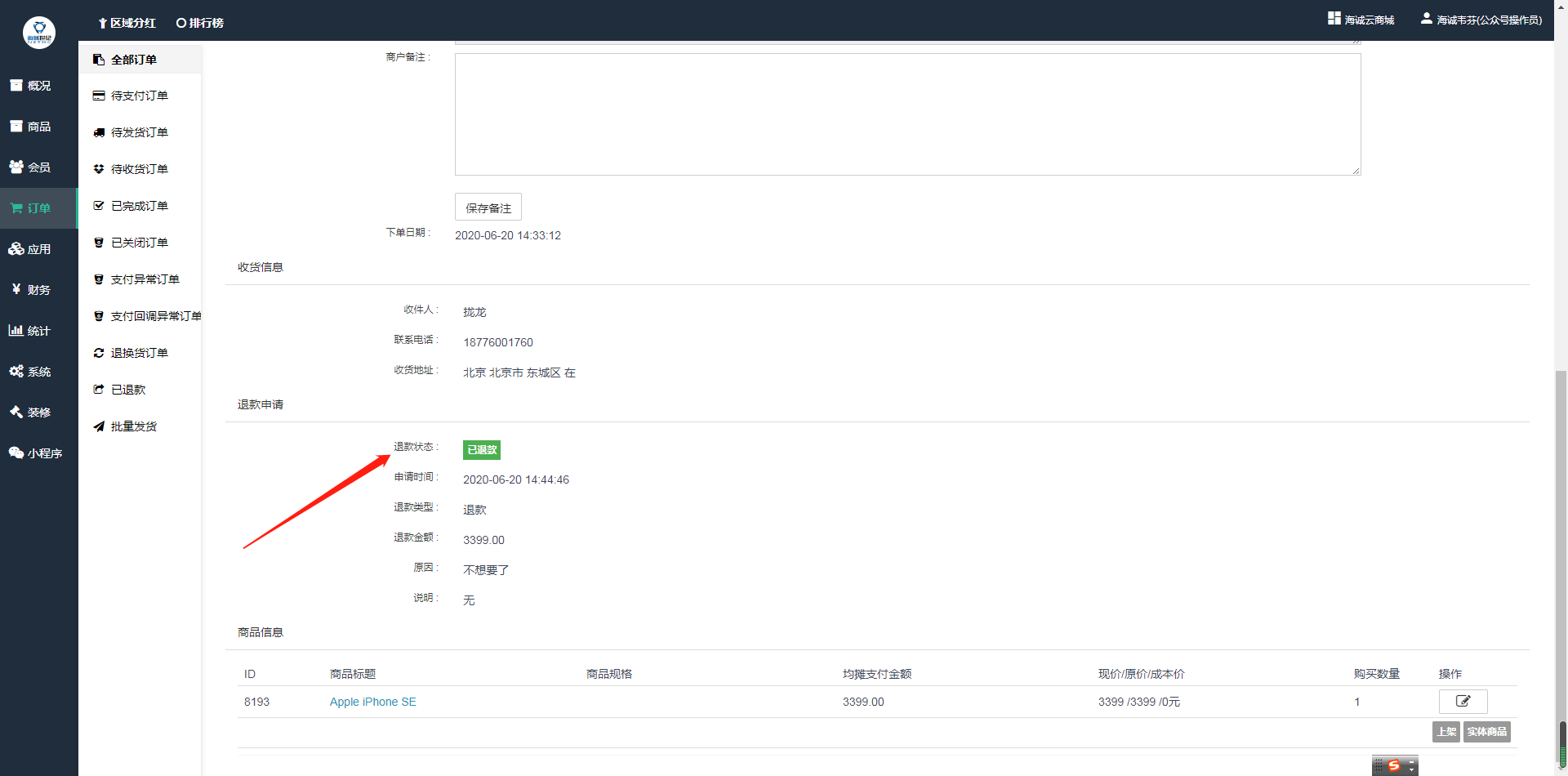 ## 买家提交申请后,商家在后台—订单管理—退换货订单中查看订单信息以及退款申请信息(退款类型、退款金额、退款原因、退款说明、退款状态)。