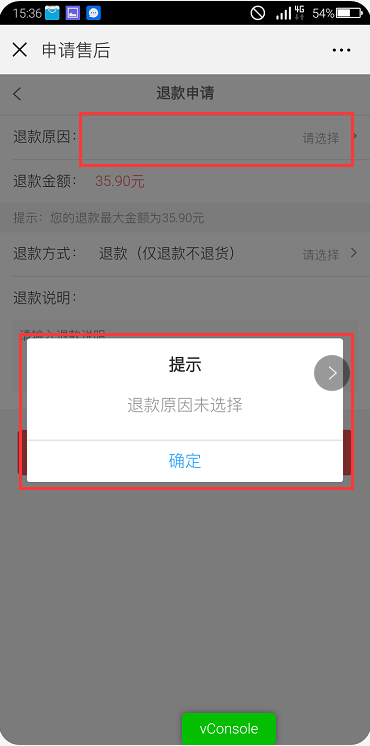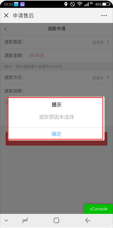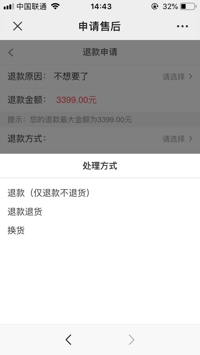 ## 注:申请售后的处理方式和退款原因必须填写,否则无法提交申请,如下图