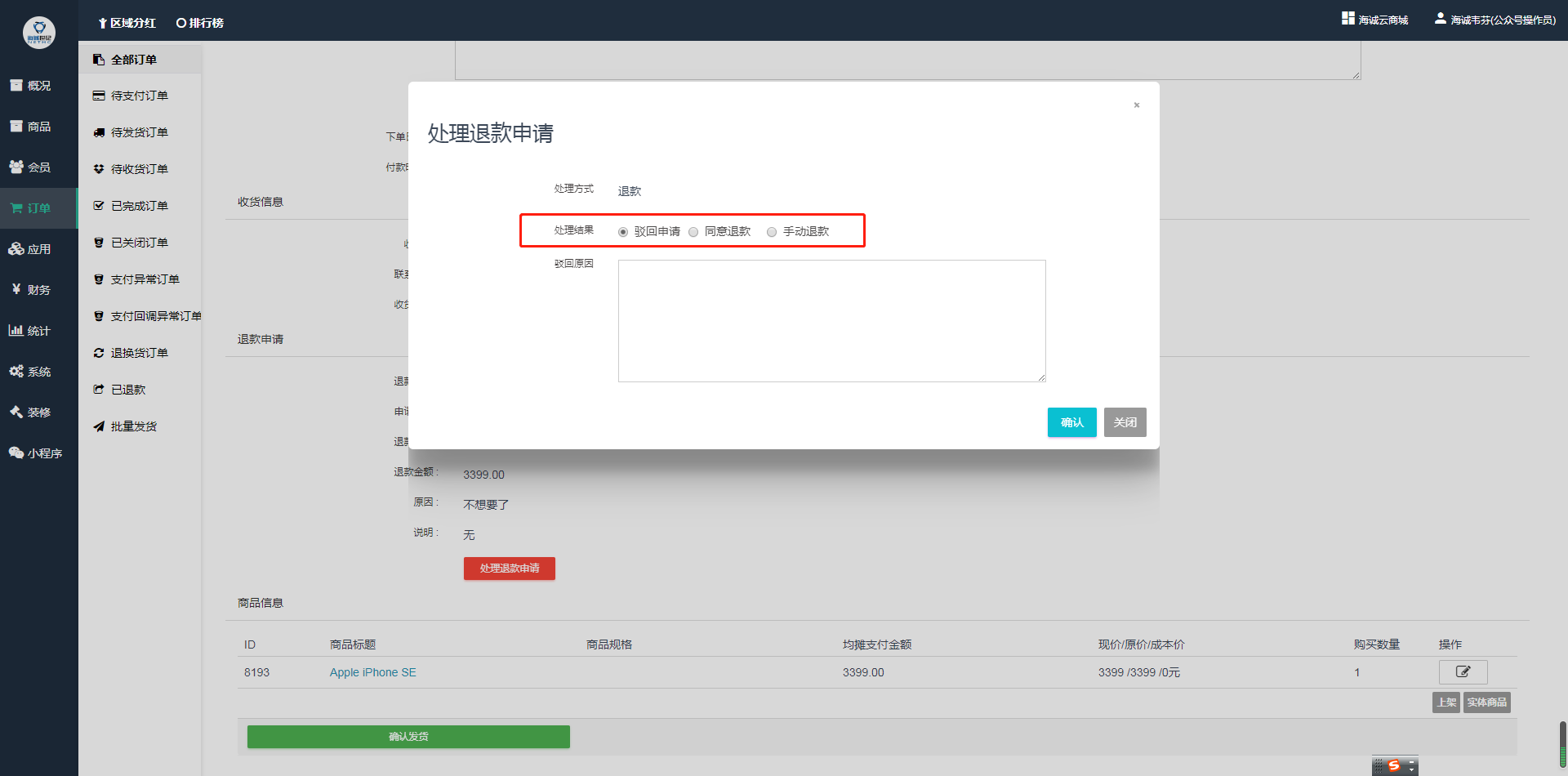 ## 商家核对信息无误后点击“处理退款申请”按钮,处理结果显示有三种,一申请驳回,二同意退款,三手动退款。