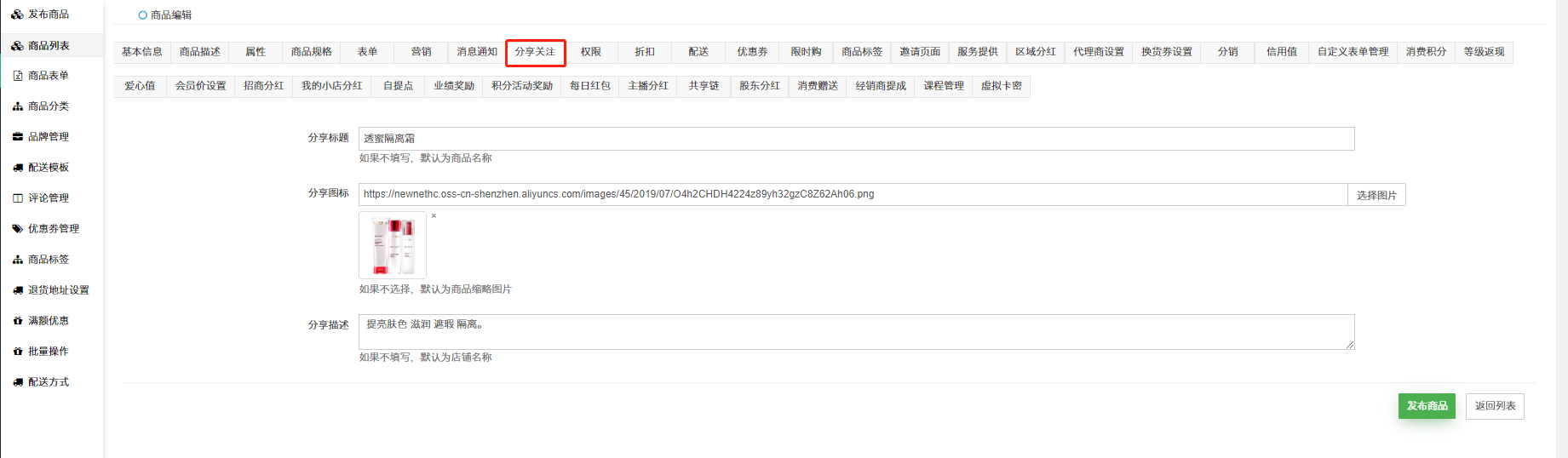 ## 分别设置完善商品的分享标题,图标和描述(注:分享到微信朋友圈是不显示商品的描述的。)