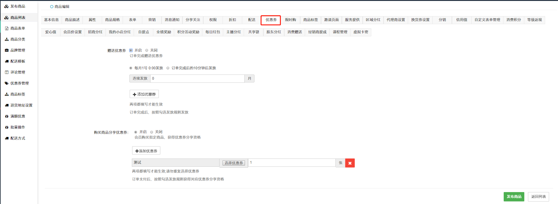 ## 单商品设置购买该商品后获得优惠券/分享优惠券。