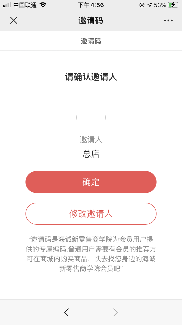 ## 用户在将商品下单/加入购物车时跳转到邀请页面,确认邀请信息是否准确 ,有误则填写邀请码重新修改上级。