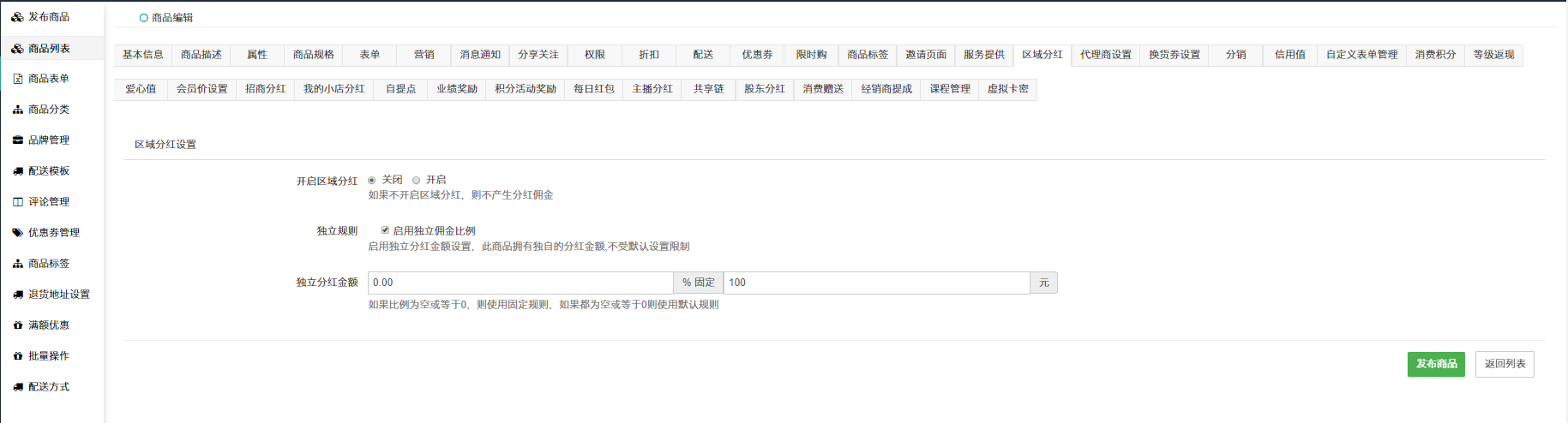 ## (2)独立分红未比例:商品内部设置分红基数10%,商品金额100元,那么最终计算该商品的分润,升级代理100*10%*2%=0.2元,市级分红100*10%*3%=0.3元,区/县分红100*10%*5%=0.5元区域奖励。