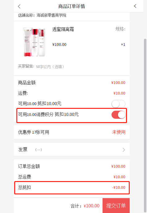 ## 设置抵扣比例0至10,则最高支持使用10个消费积分进行抵扣。