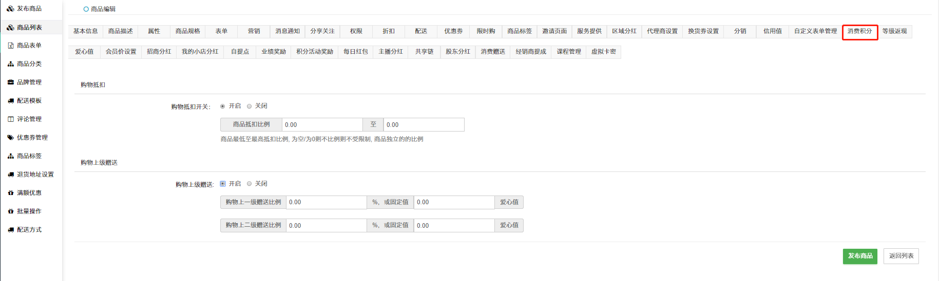 ## (1)购物抵扣:设置最低和最高抵扣比例,该商品则支持使用消费积分进行抵扣。