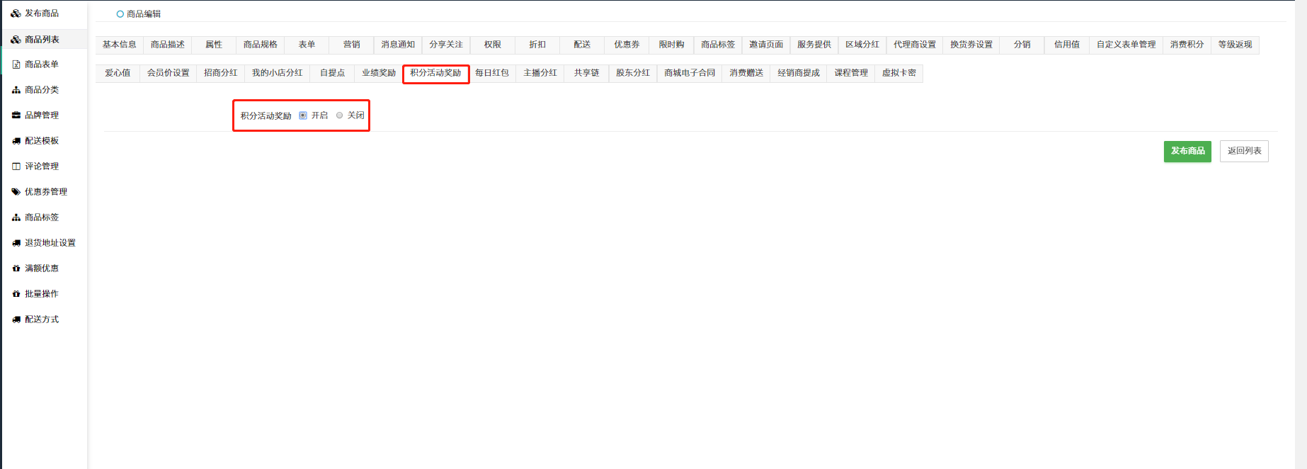 ## 单商品选择开启或关闭,开启后该商品参与积分活动。