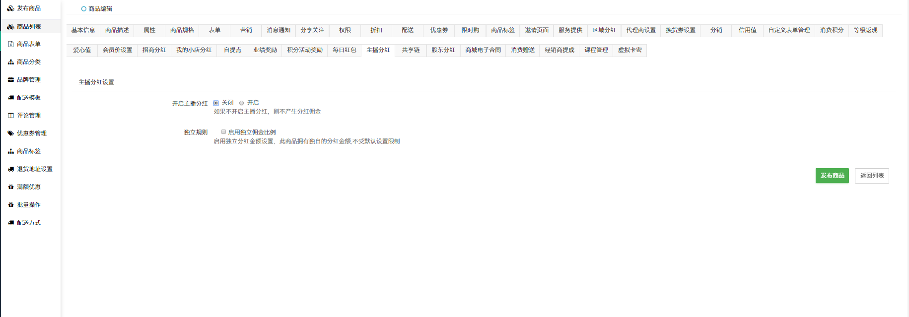 ## 独立规则:开启后,该商品通过直播间销售出去的提成比例按照商品单独设置的规则计算。