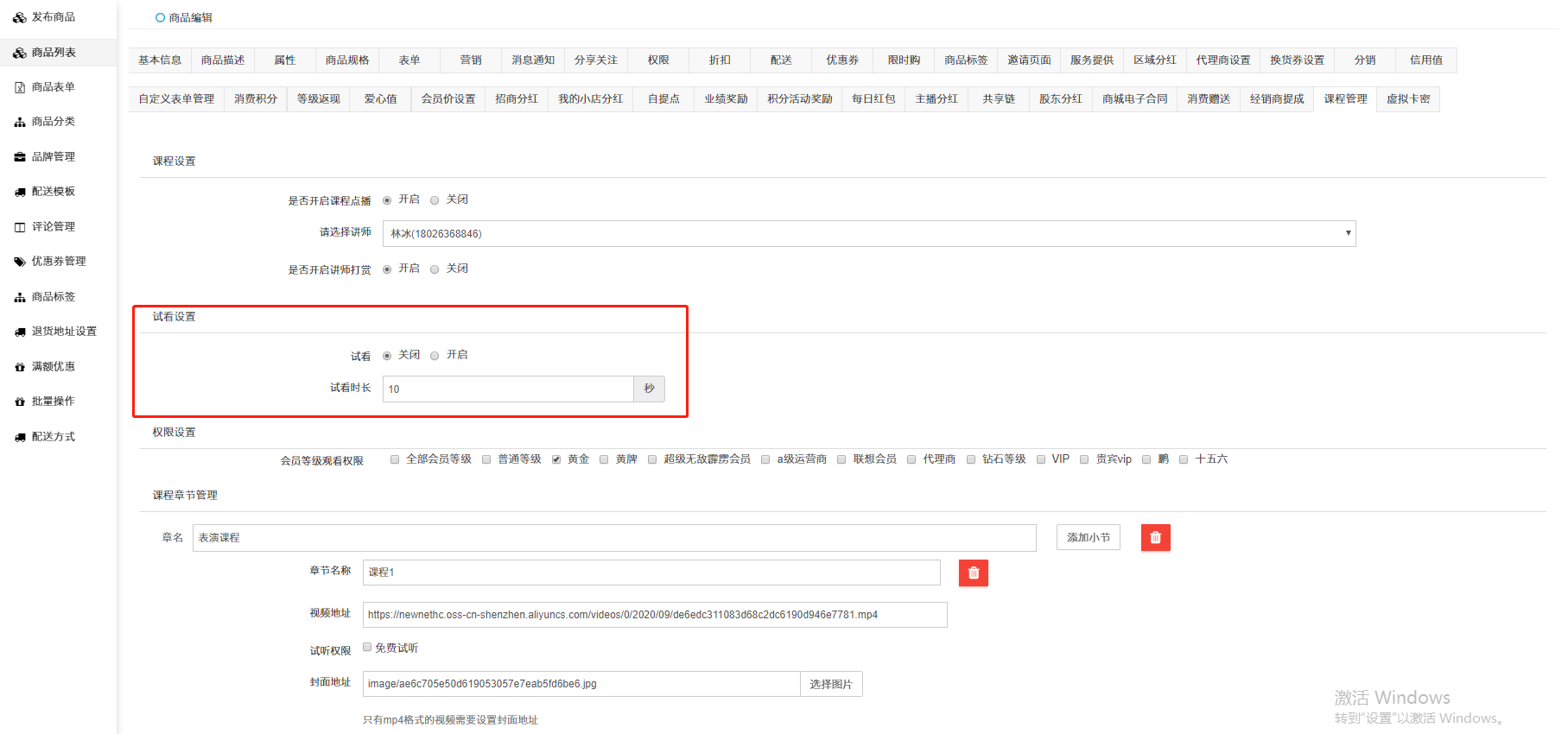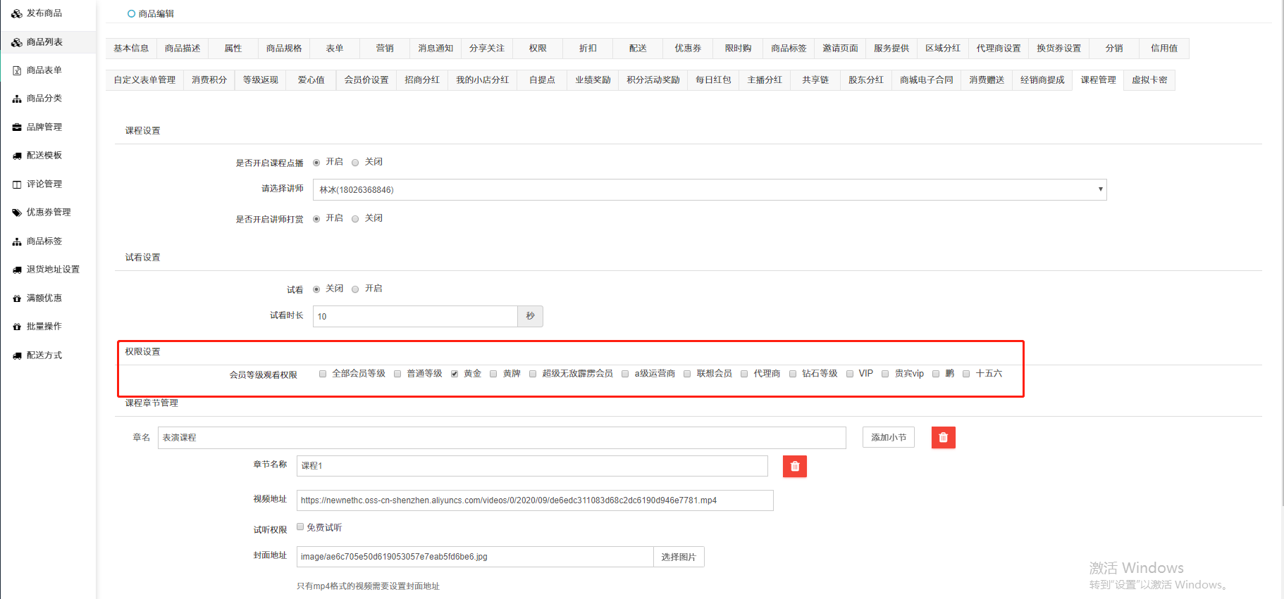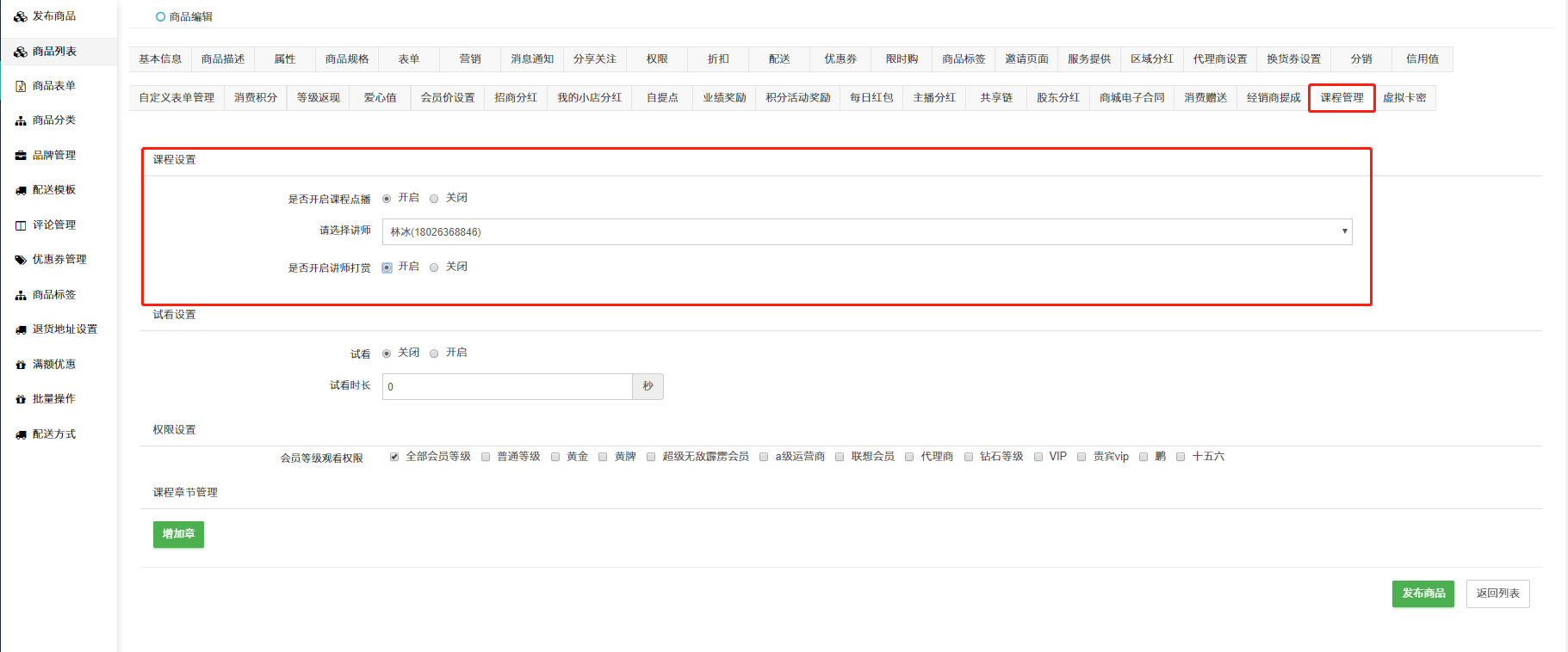 ## ②选择讲师:选择该视频的讲师,如设置了讲师分红,会员购买该课程,讲师可以获得分红比例。