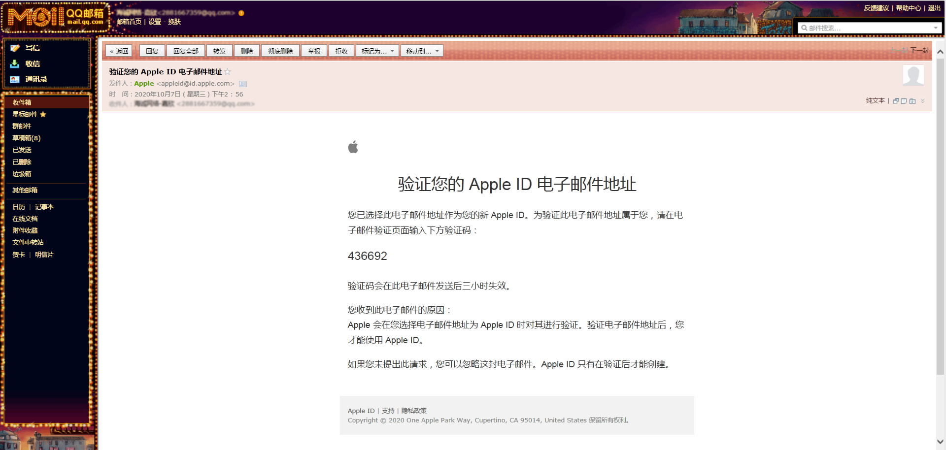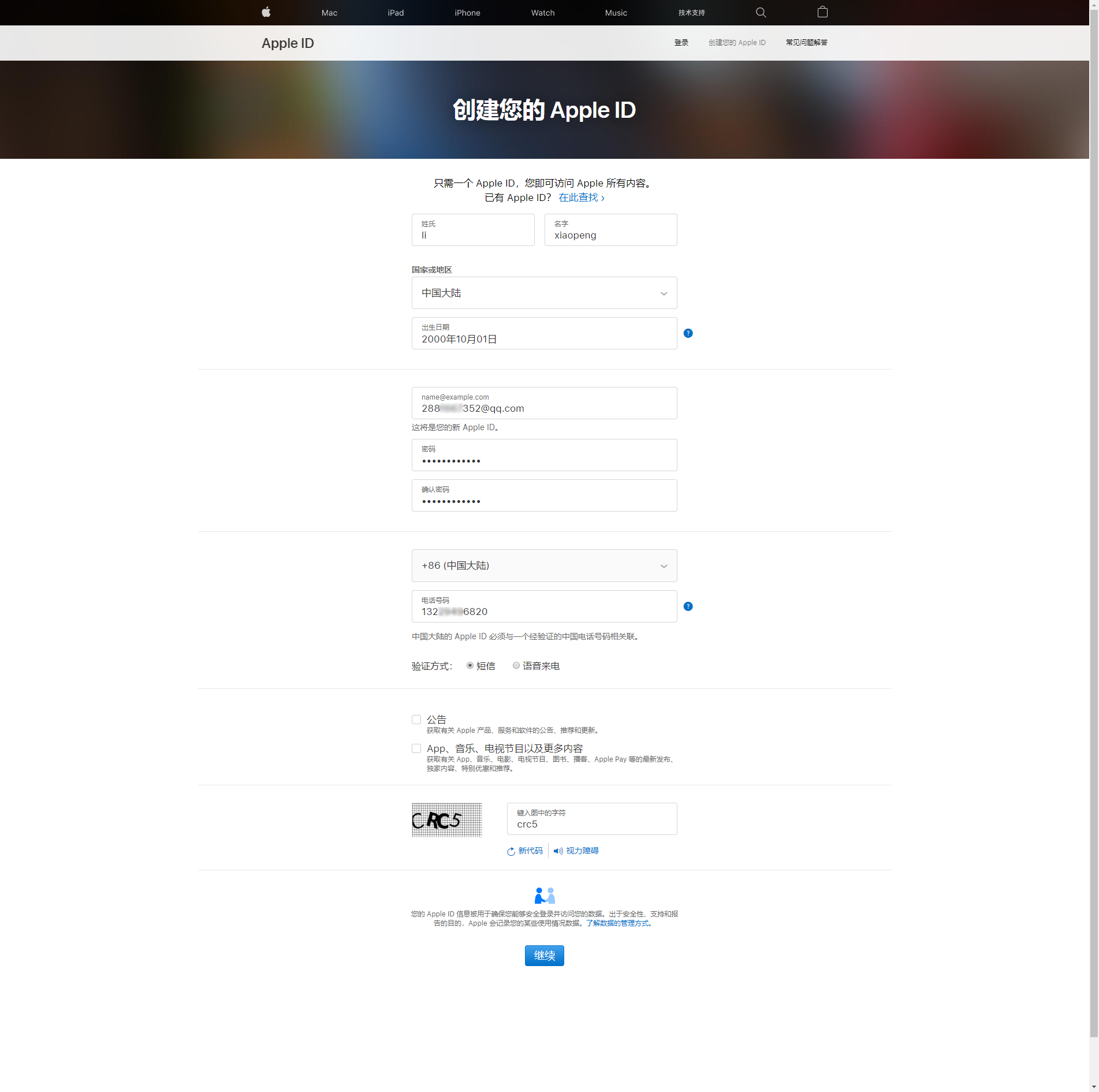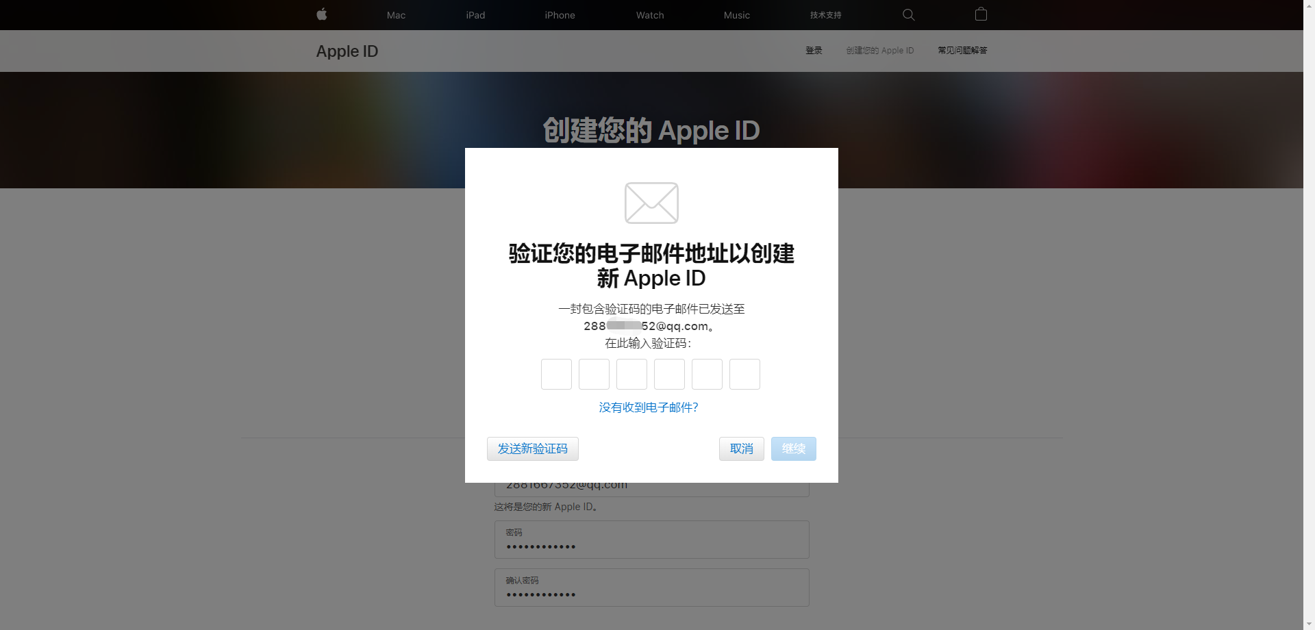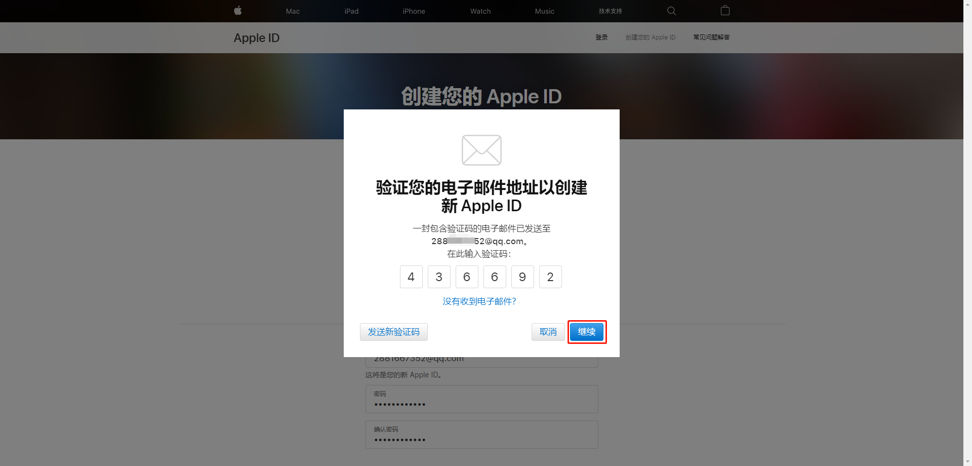 ### **这里需要登录注册的邮箱号,苹果会发送6位数纯数字验证码到注册的邮箱上,需要把验证码填写进苹果注册页面点击“继续”即完成账号注册。**