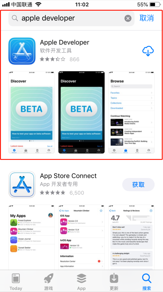 ### 1.打开App Store应用市场,下载一款App名为“**Apple Developer应用程序**”并下载安装到手机内。