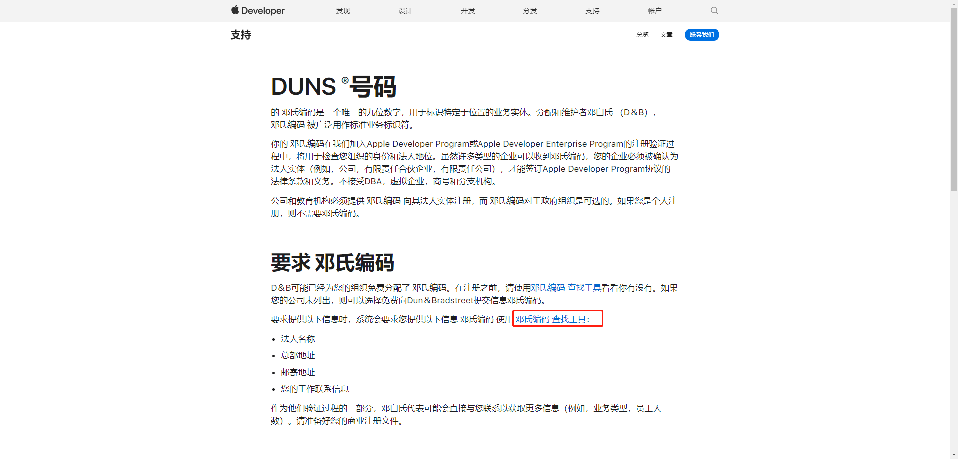 ## 1、打开邓白氏申请网站 [**点击前往邓白氏网站**。](https://idmsa.apple.com/IDMSWebAuth/signin?appIdKey=891bd3417a7776362562d2197f89480a8547b108fd934911bcbea0110d07f757&path=%2Faccount%2F&rv=1)