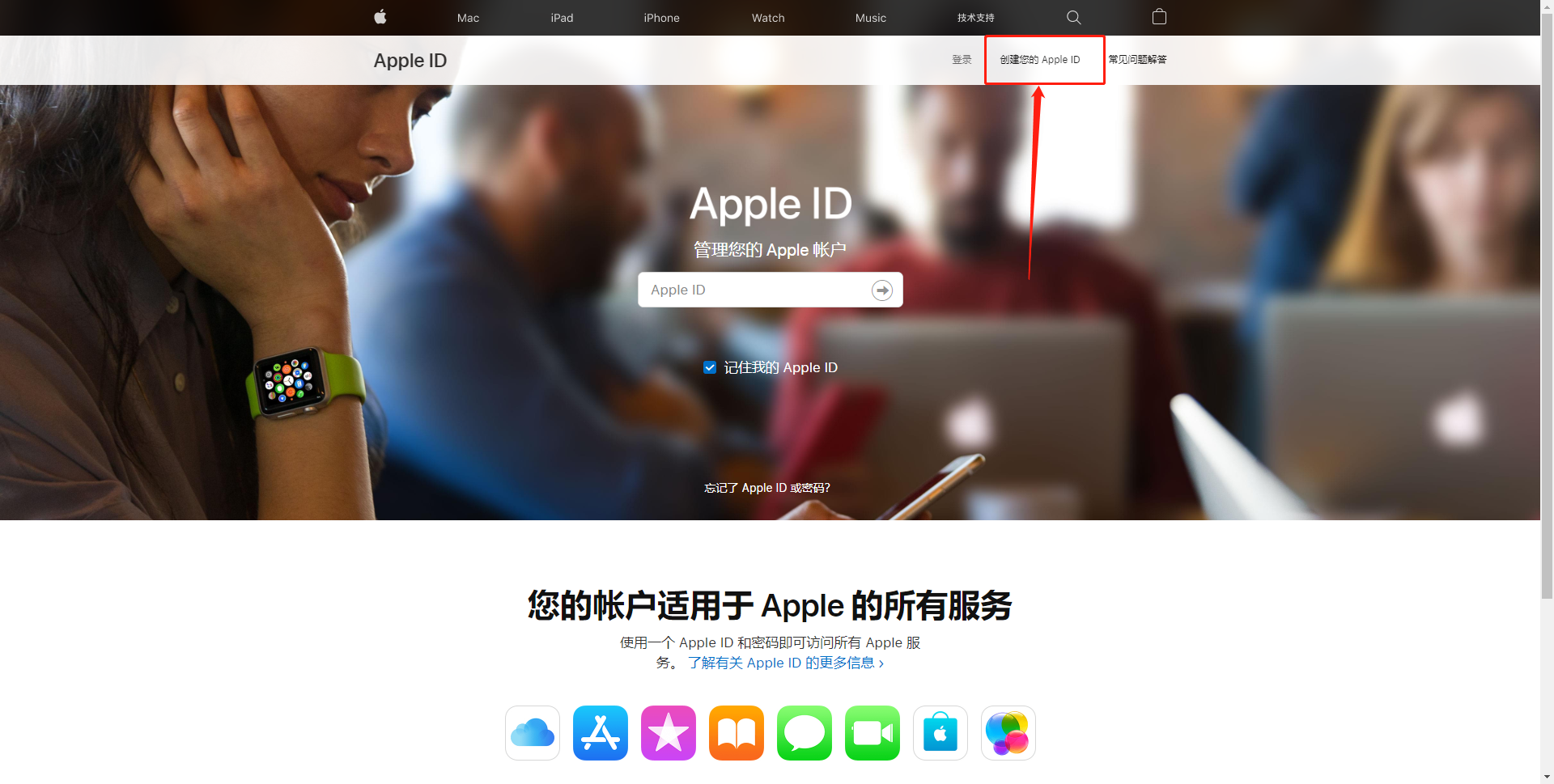 ## **2.点击右上角第二个按钮“创建您的 Apple ID。”**