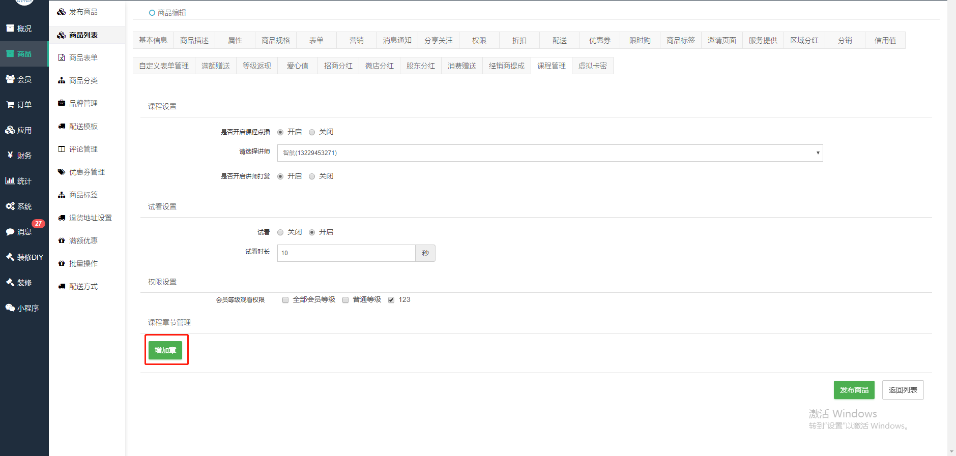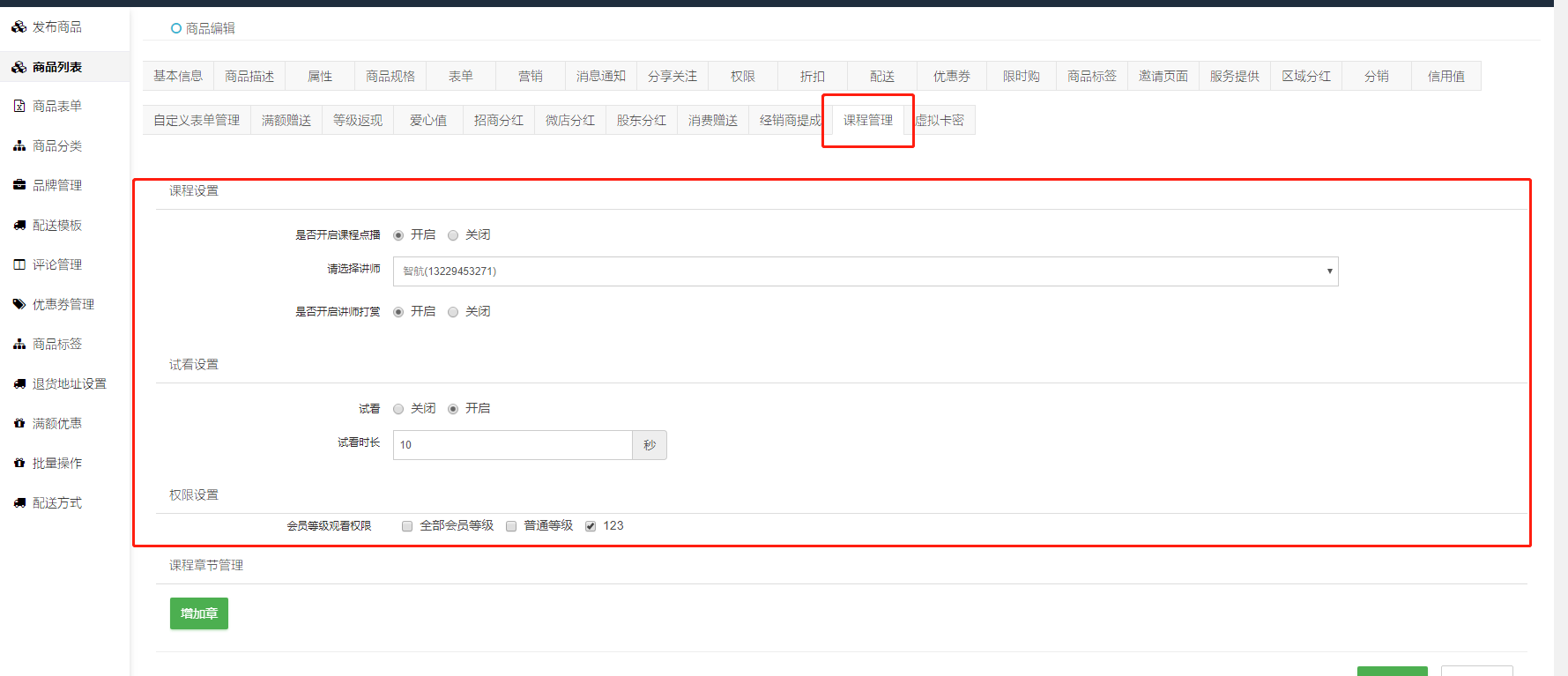 ## 3、点击课程管理,开启视频点播,然后选择好讲师。讲师和试看功能可按需求选择性开启。