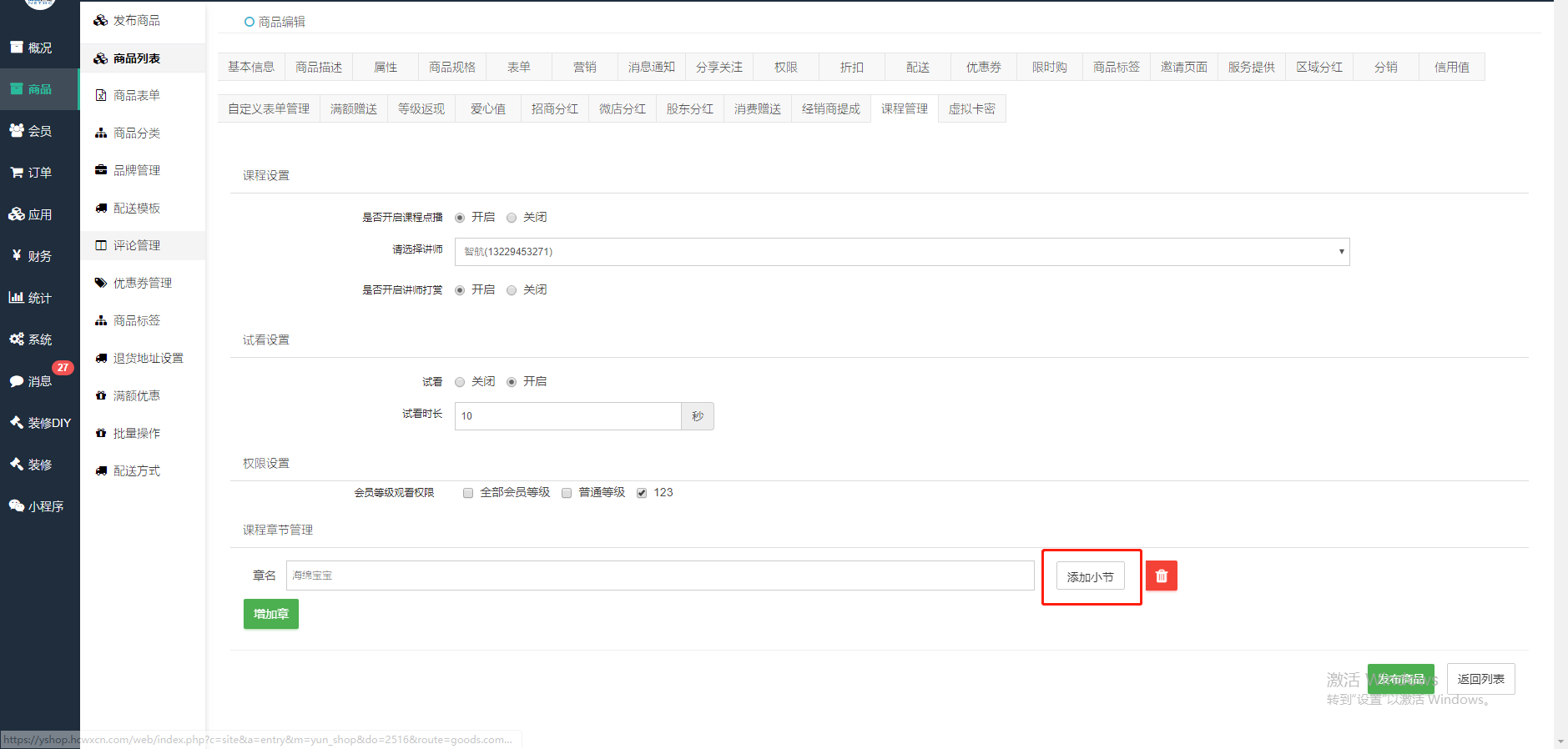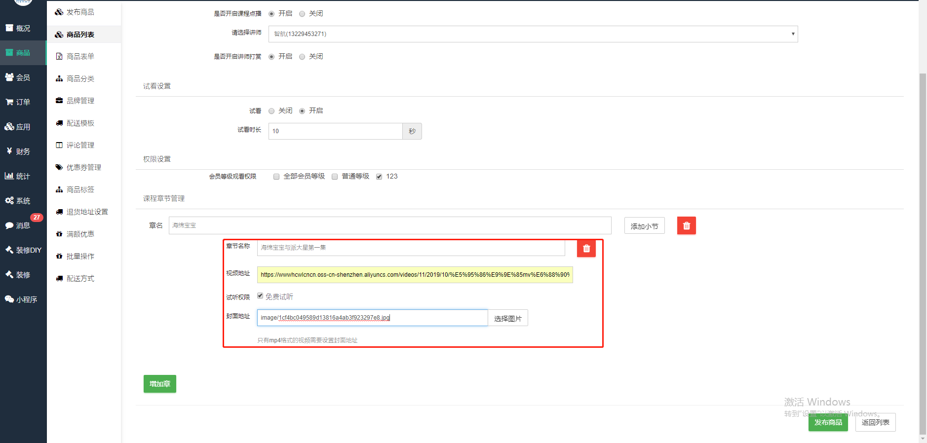 ## 5、点击“添加小节”按钮,并填写好小节课程名称和视频连接。试听权限和封面地址可选择性开启。
