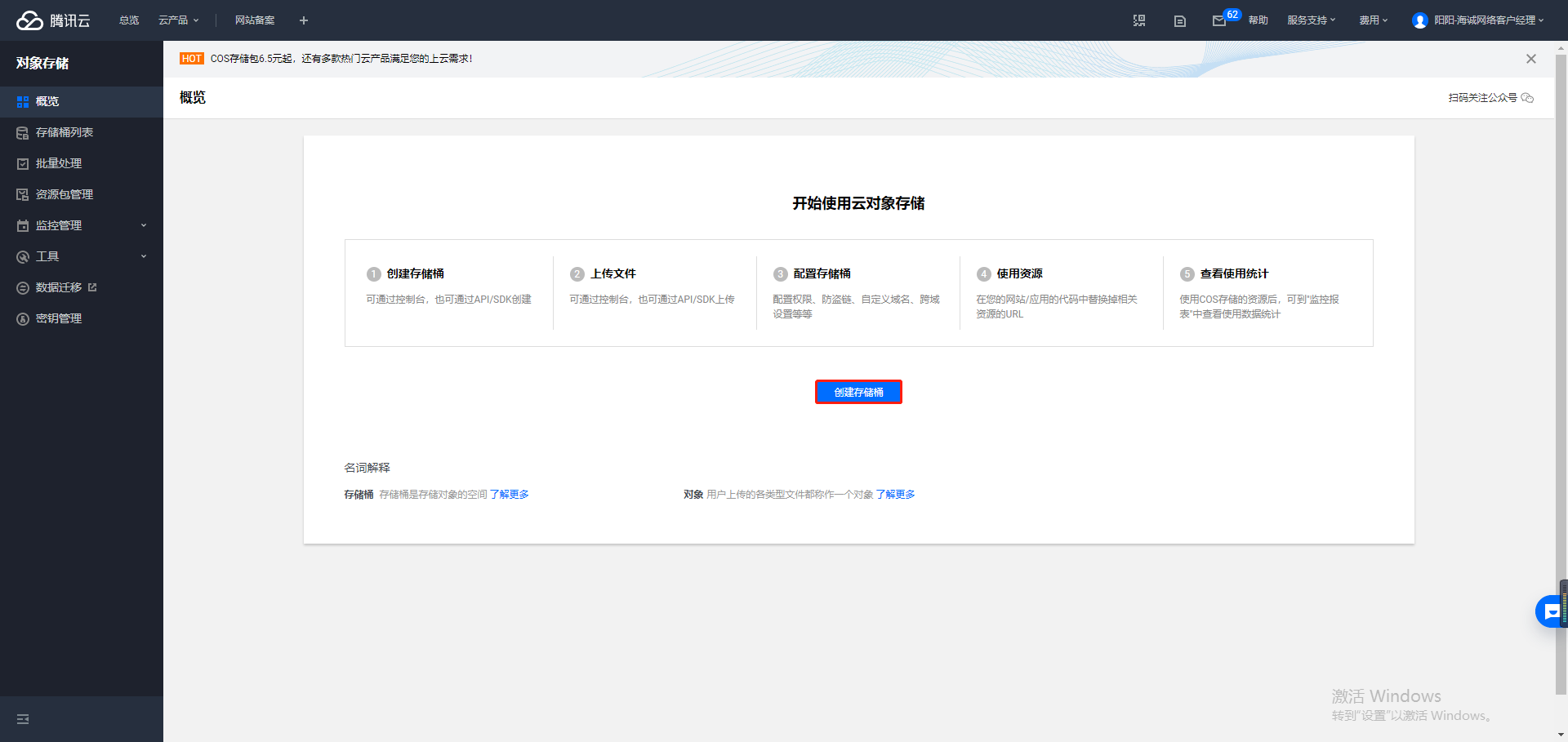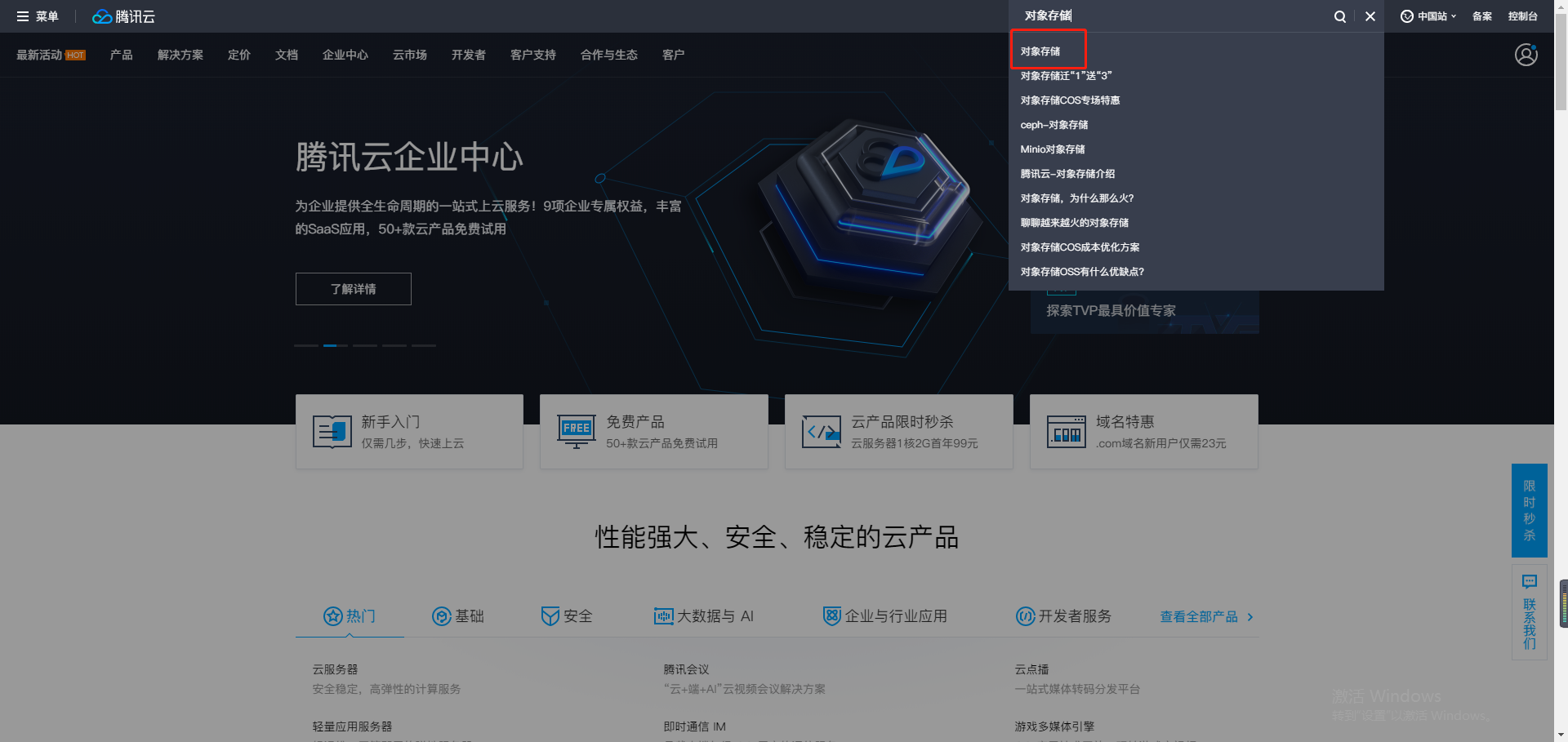## 1. 登录腾讯云后台:https://cloud.tencent.com/ ,搜索对象存储功能,点击进去,并在下一步点击立即使用。