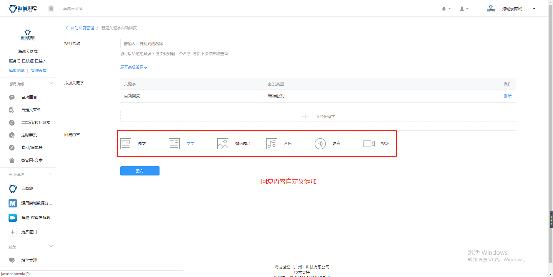 ## 2.添加关键字回复。