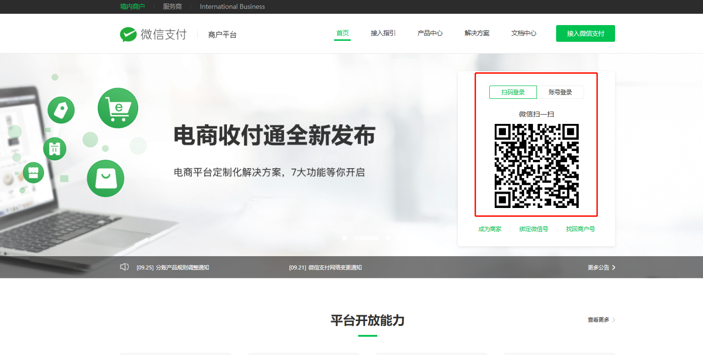 ## 1.登录支付商户网址后台https://pay.weixin.qq.com/。(运营者扫码登陆(常用建议)或者账号密码登陆)