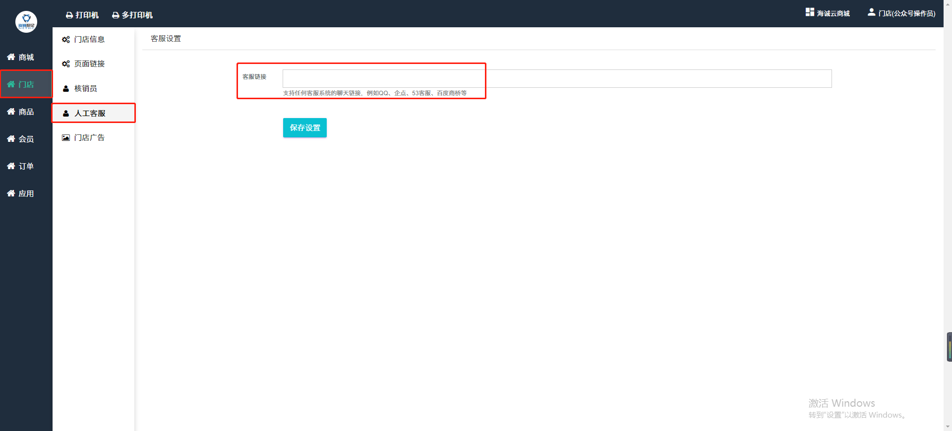 ## 登录门店后台,门店后台登录账号密码为总平台创建的,登录地址跟总平台一样,登录后点击门店—人工客服填写客服链接即可。