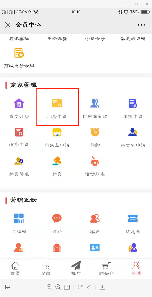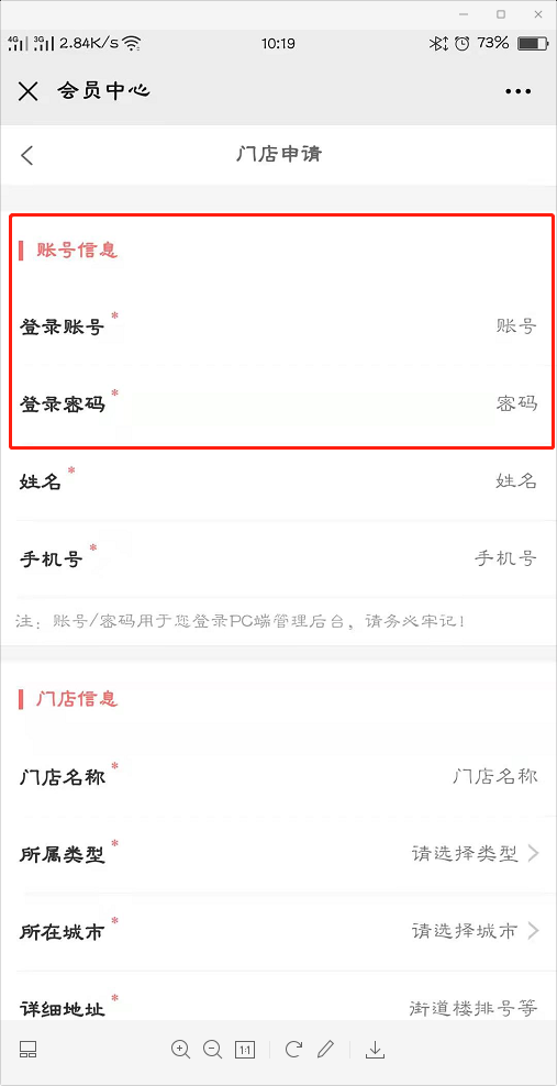 ## 路径:进入公众号、会员中心、门店申请。