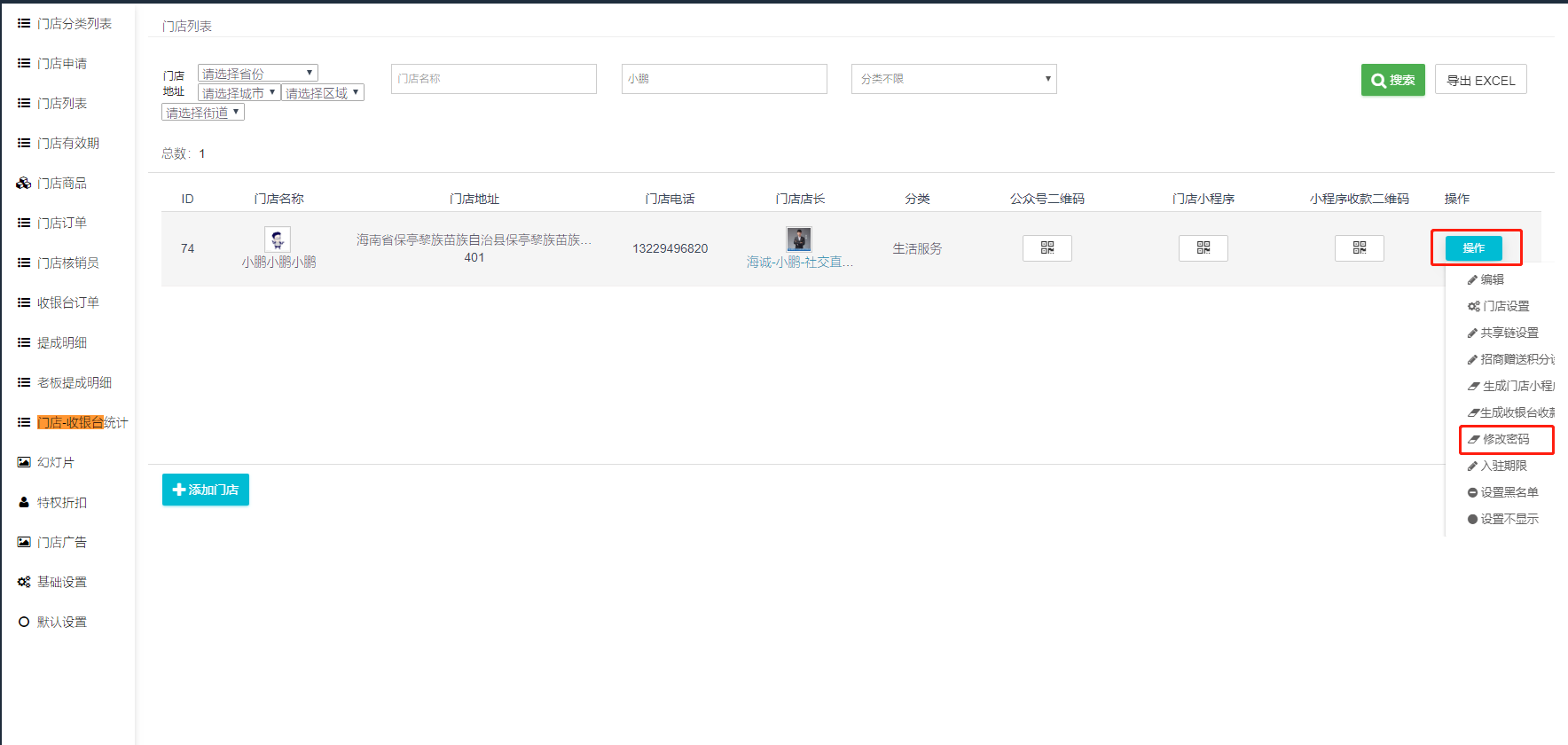 ## 1.2找到需要修改的门店。点击“操作”——“修改密码”,即可进行修改门店登录密码。