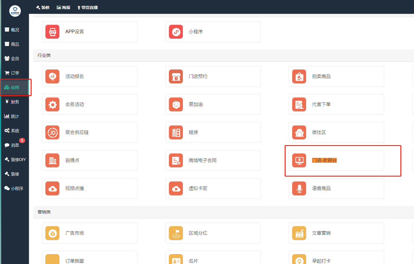## 1.1登录后台,找到门店收银台功能。