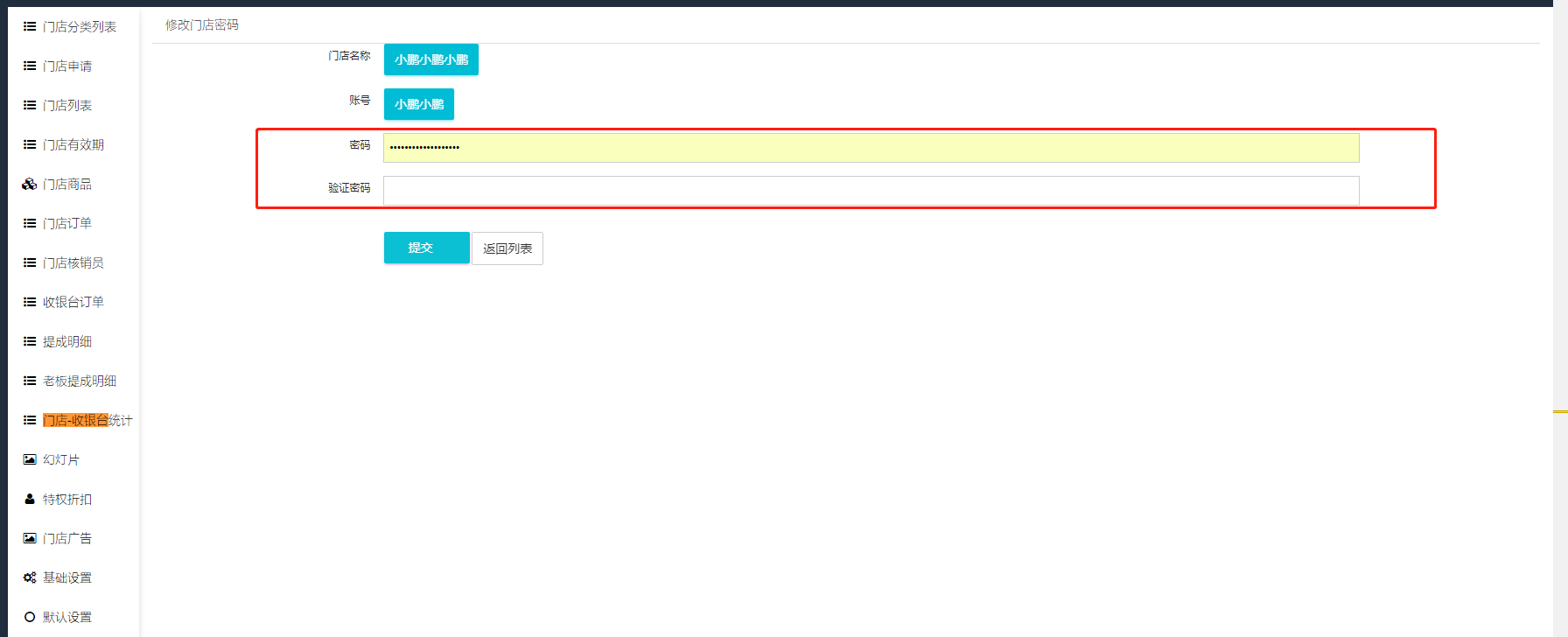 ### 如果门店店主忘记了登录门店的账号密码。可以通过总平台给对应的门店进行修改密码。在将修改好的新密码发给店主即可。