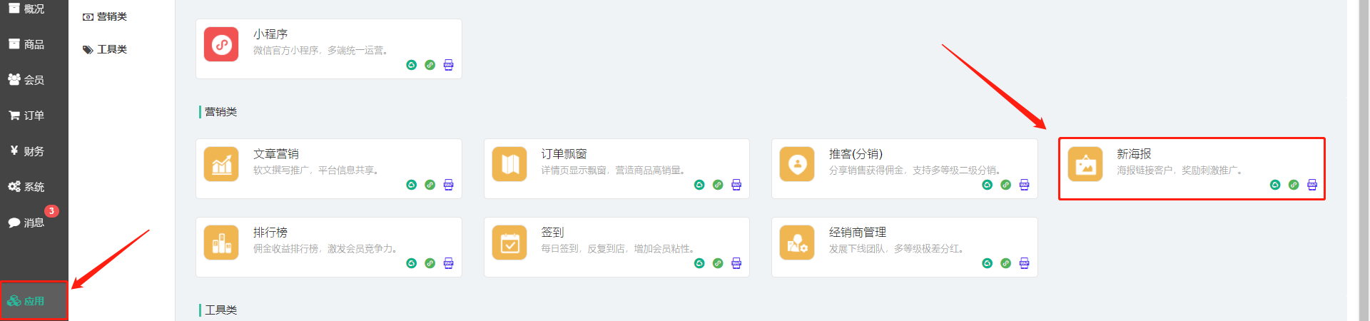 ## 我现在需要更换**推广海报**的底图,那么就需要进入我们的系统后台内,在**应用**里面找到**新海报**功能里面进行更换海报底图。