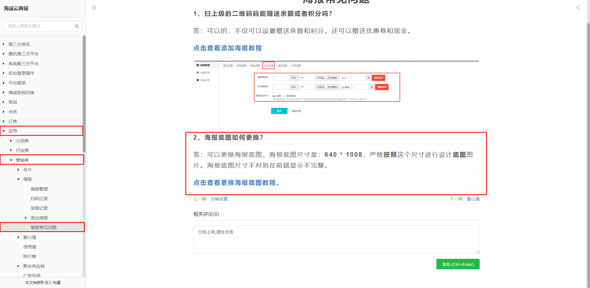 ## 接着上一步说修改海报底图的问题。那么也是在教程里面找到**应用、营销类、海报、海报常见问题**即可以找到该教程说明,跟着教程操作即可修改海报底图的操作。