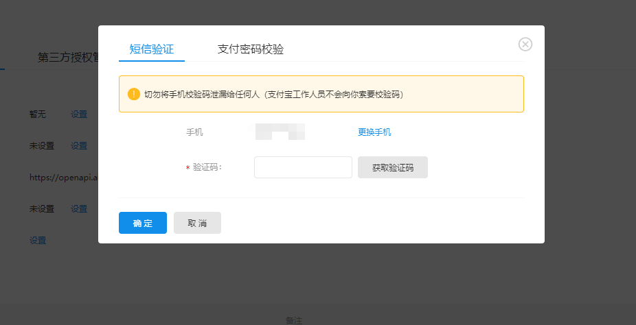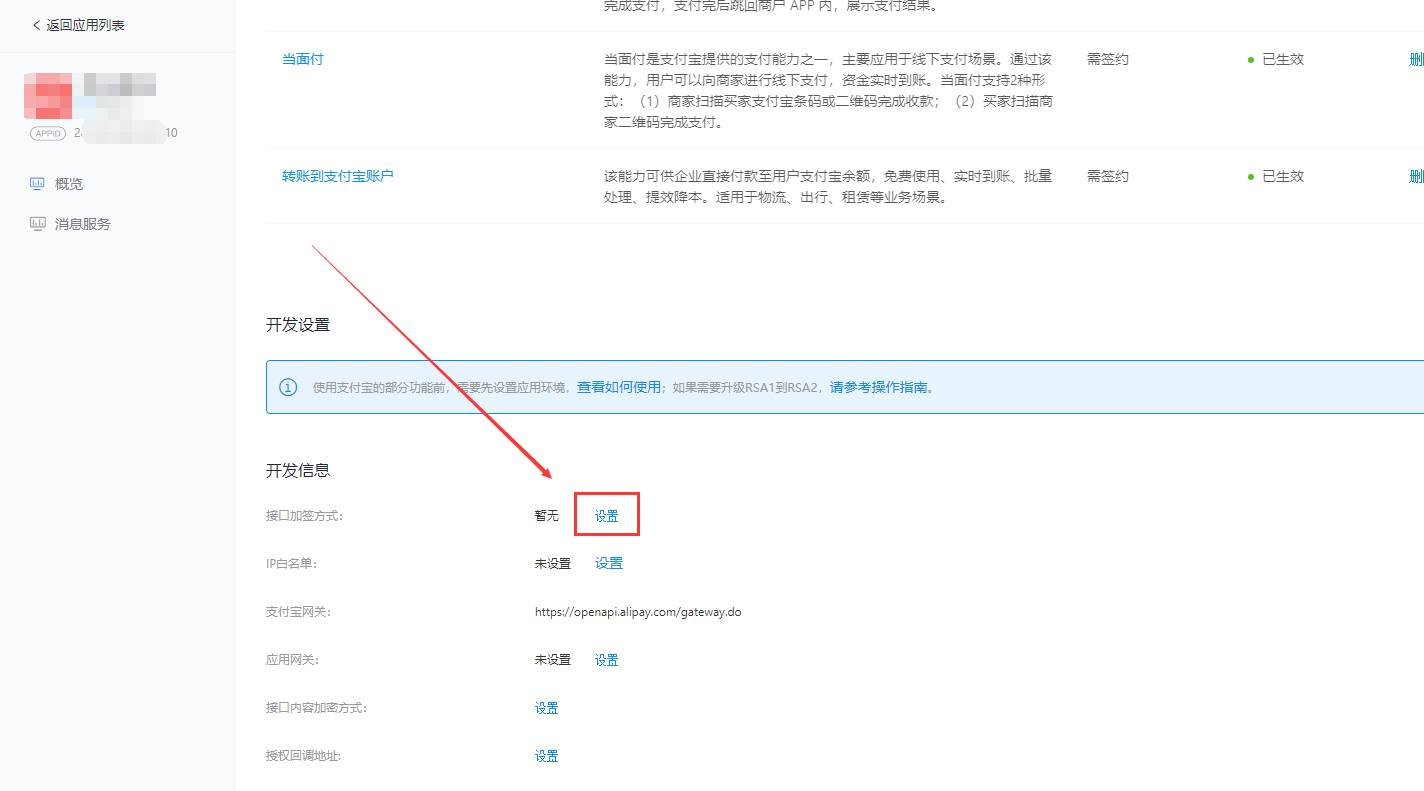 ## 3、登录[开发者中心控制台](https://open.alipay.com/platform/developerIndex.htm)\> 在相应应用点击进入管理后台 >**开发设置**\>**接口加签方式**设置。点击**设置**后,输入手机验证码