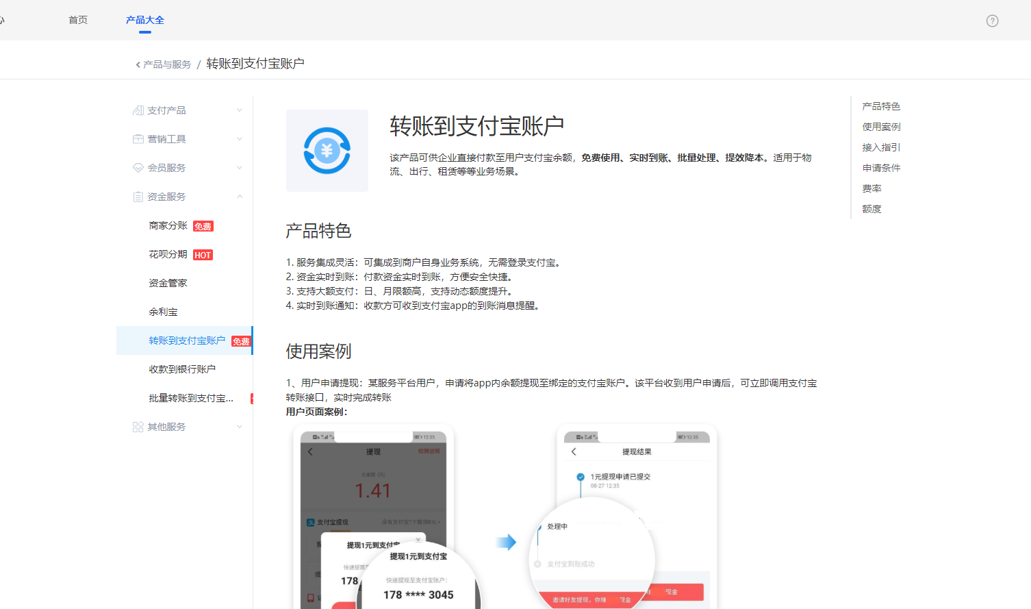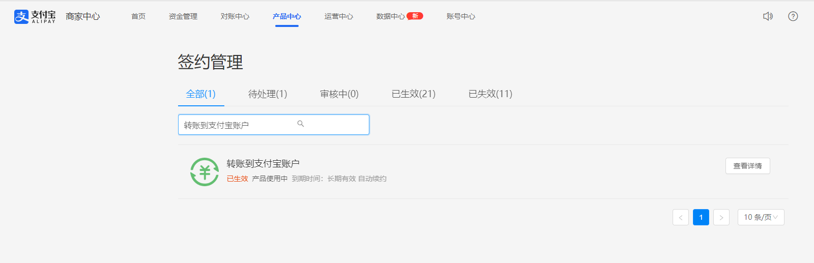 ## 一、登录企业支付宝账户([www.alipay.com](http://www.alipay.com/)),进入首页--产品中心-我的产品--全部产品-开通单笔转账到支付宝账户[https://b.alipay.com/signing/productDetailV2.htm?productId=I1012000291000001000](https://b.alipay.com/signing/productDetailV2.htm?productId=I1012000291000001000),若有已经开通(显示已生效、产品使用中)可不用再开通。