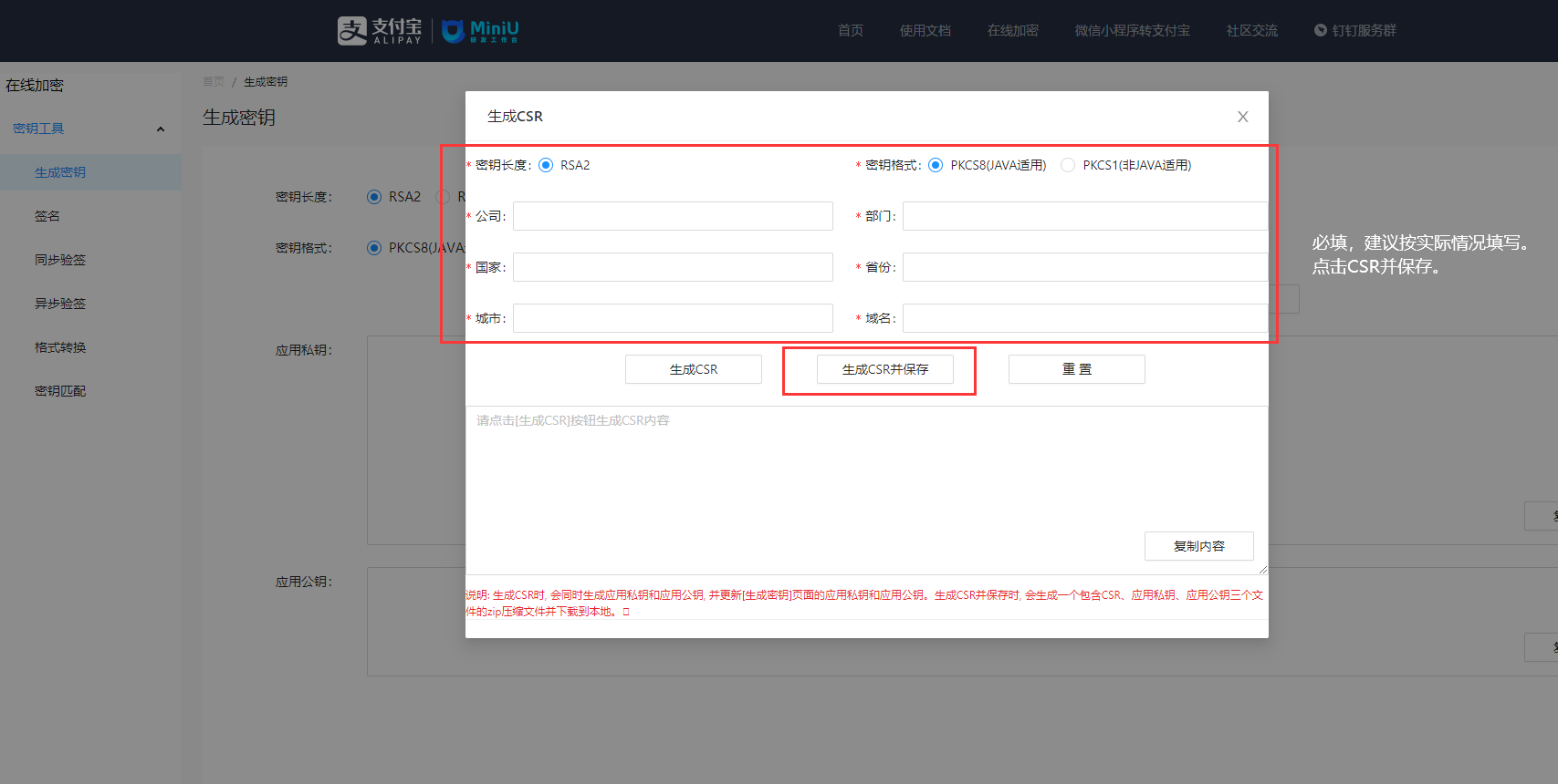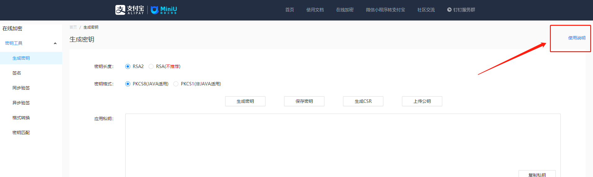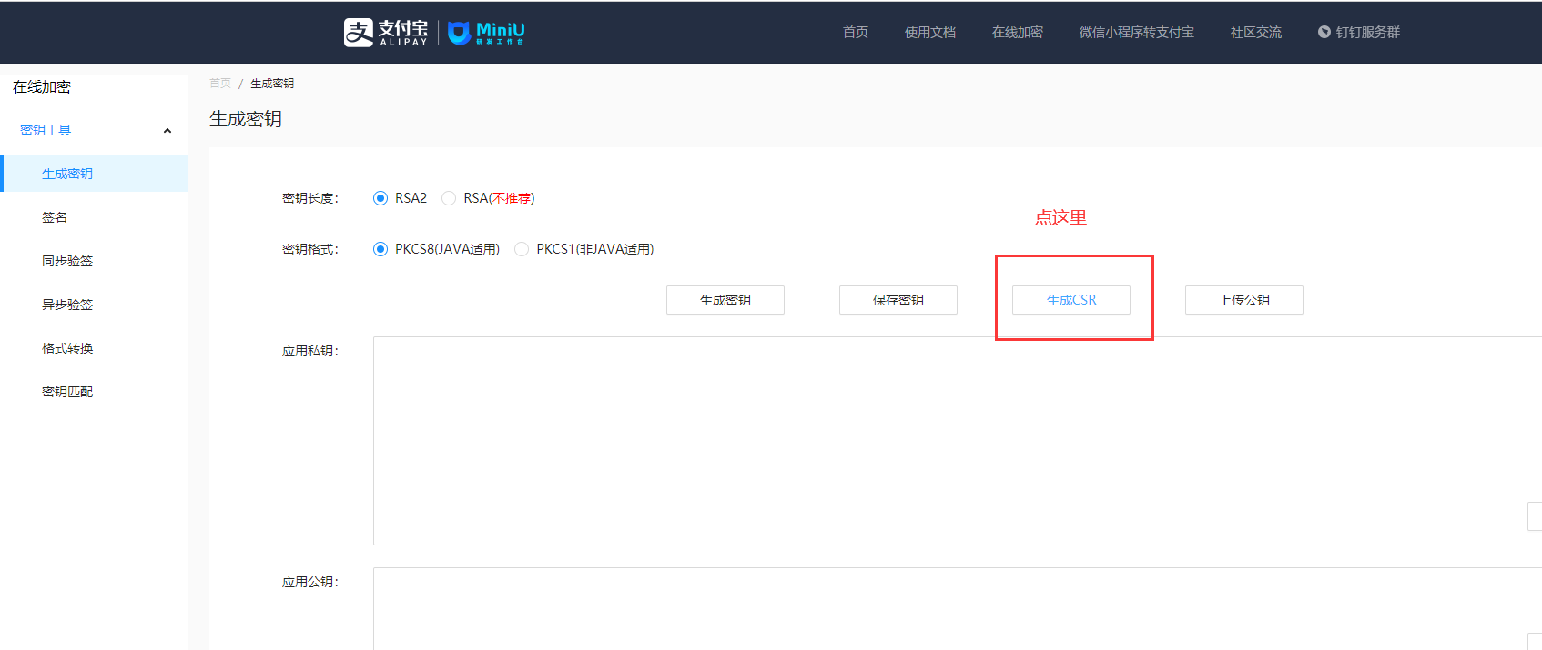 ## 1、进入[MiniU](https://miniu.alipay.com/)官网 在线密钥->生成密钥菜单页面,密钥长度选择RSA2,密钥格式选择PKCS8(Java适用),点击生成CSR 按钮,进入生成应用公钥证书 CSR 文件页面。详情可点开使用说明可以查看生成公钥证书方式。