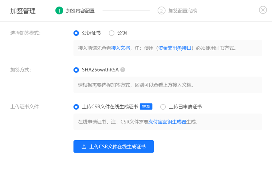## 加签模式选择**公钥证书 ,上传证书文件**选择**上传 CSR 文件在线生成证书**即可完成公钥证书的设置。