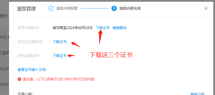 ## 4、上传成功后,可查看、下载已生成(或已上传)的应用公钥证书,以及下载对应的支付宝公钥证书、支付宝根证书。