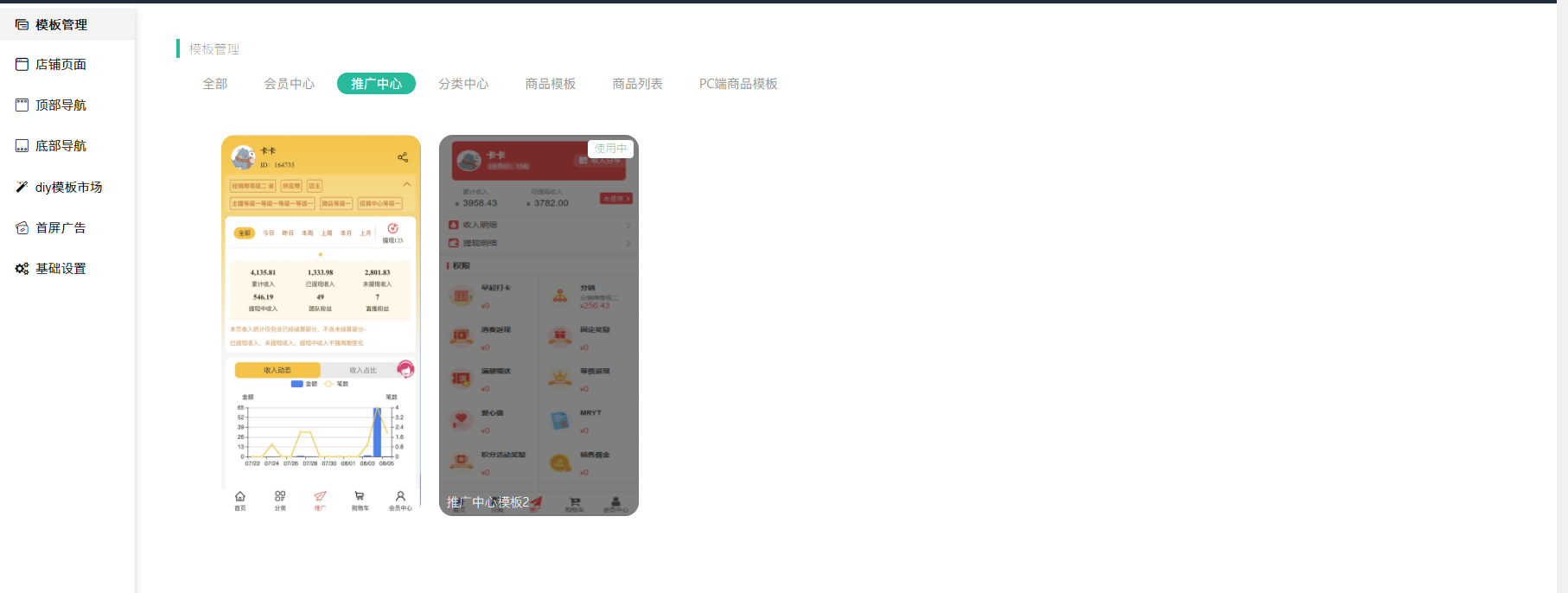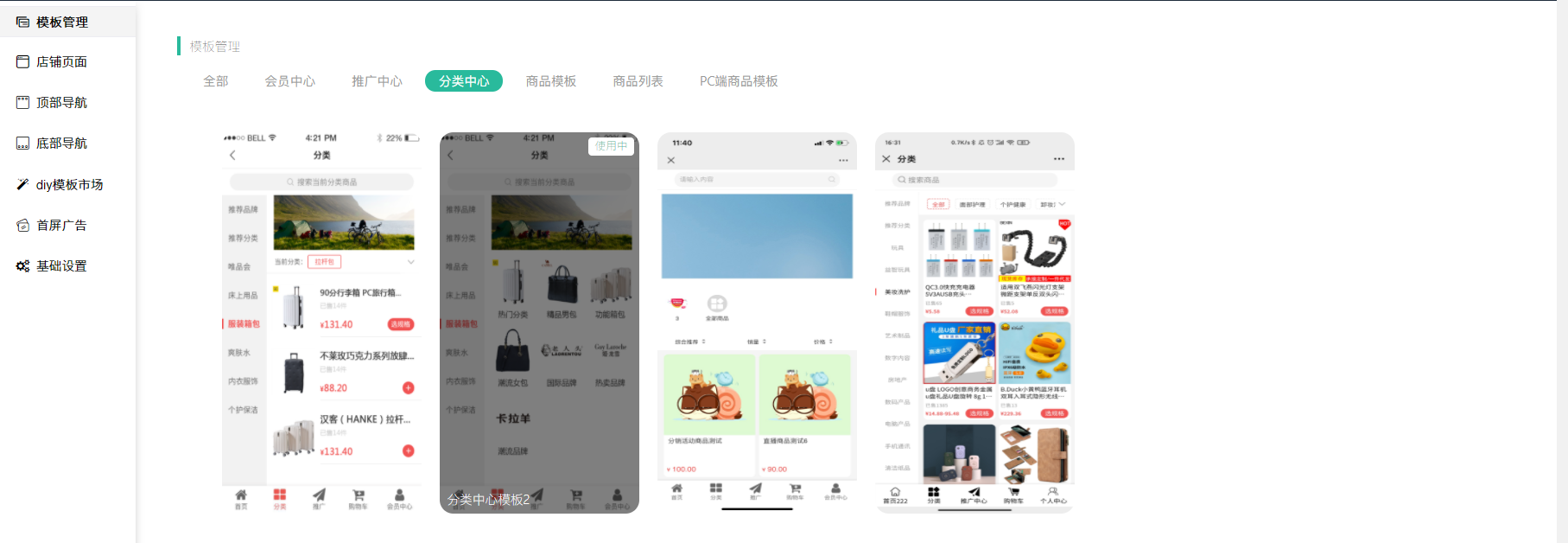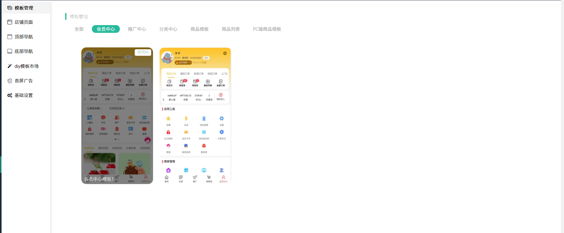 ## 提供会员中心、推广中心、分类中心、商品模板,商品列表、PC端商品模板选择。