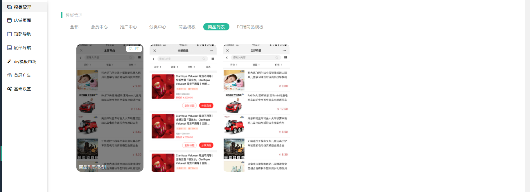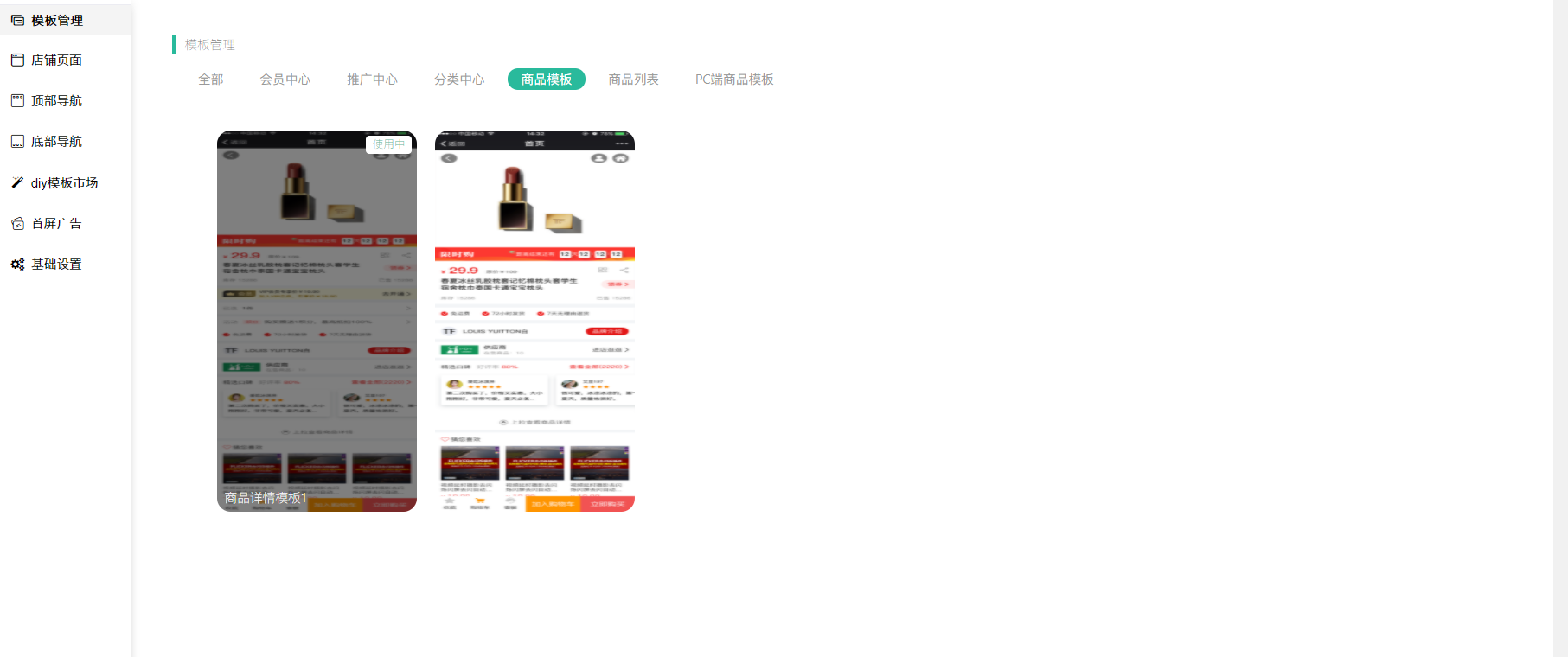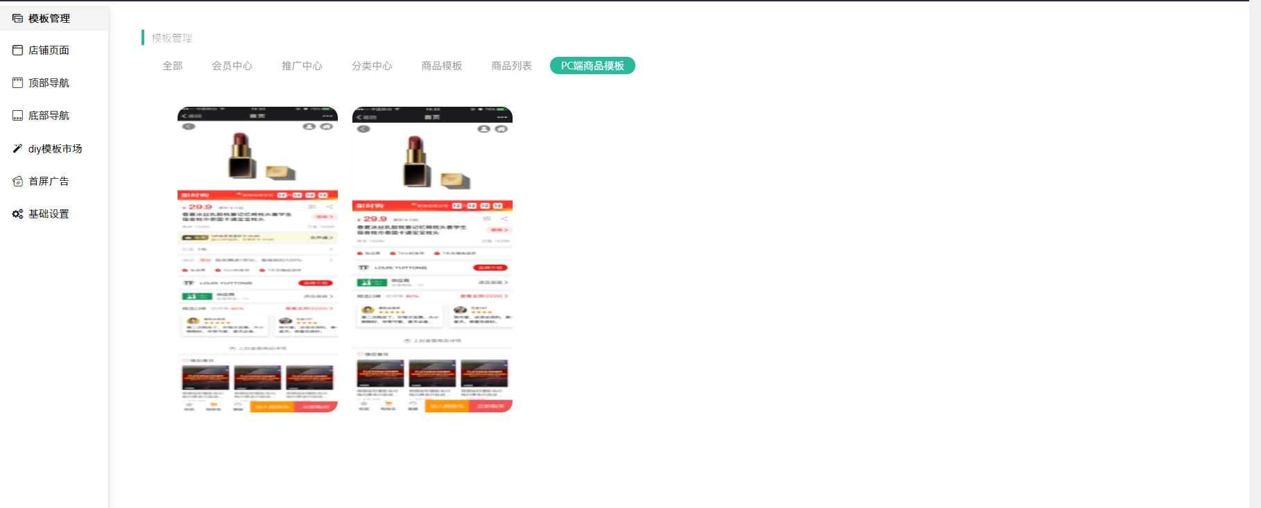 ## 提供会员中心、推广中心、分类中心、商品模板,商品列表、PC端商品模板选择。