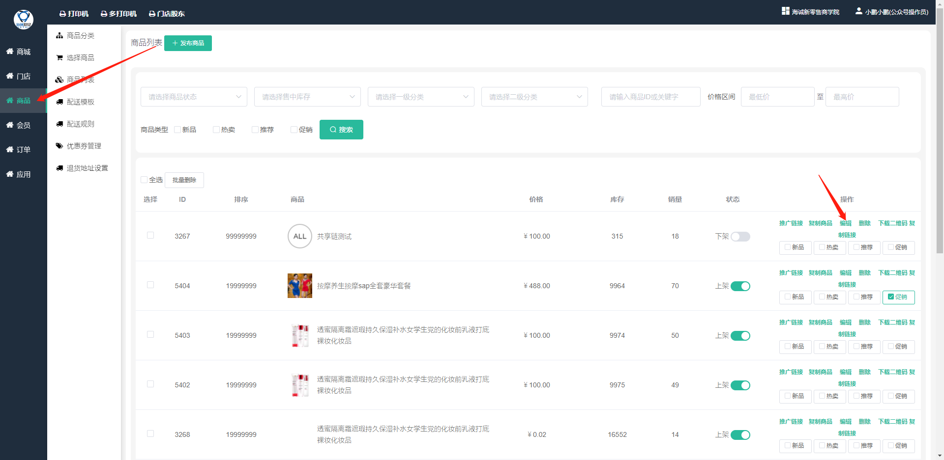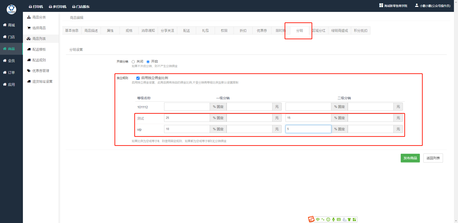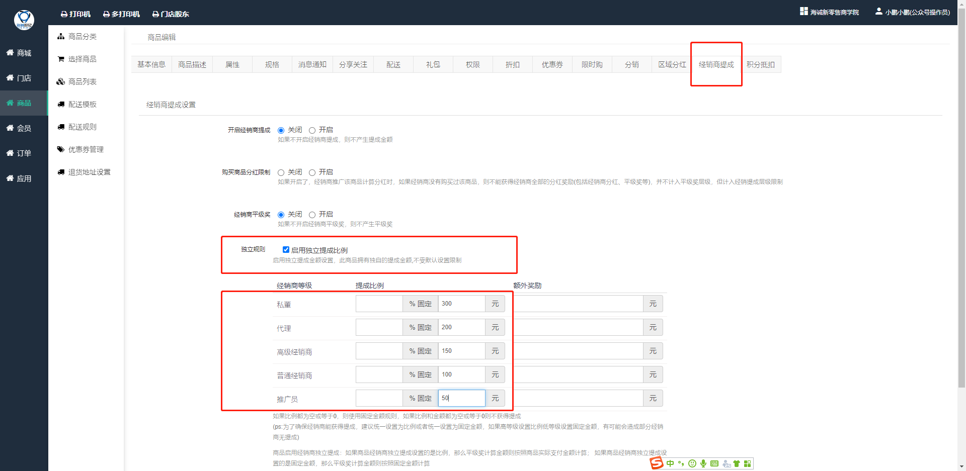 ## 5、门店产品设置分润比例。分润全部都是商品内单独设置