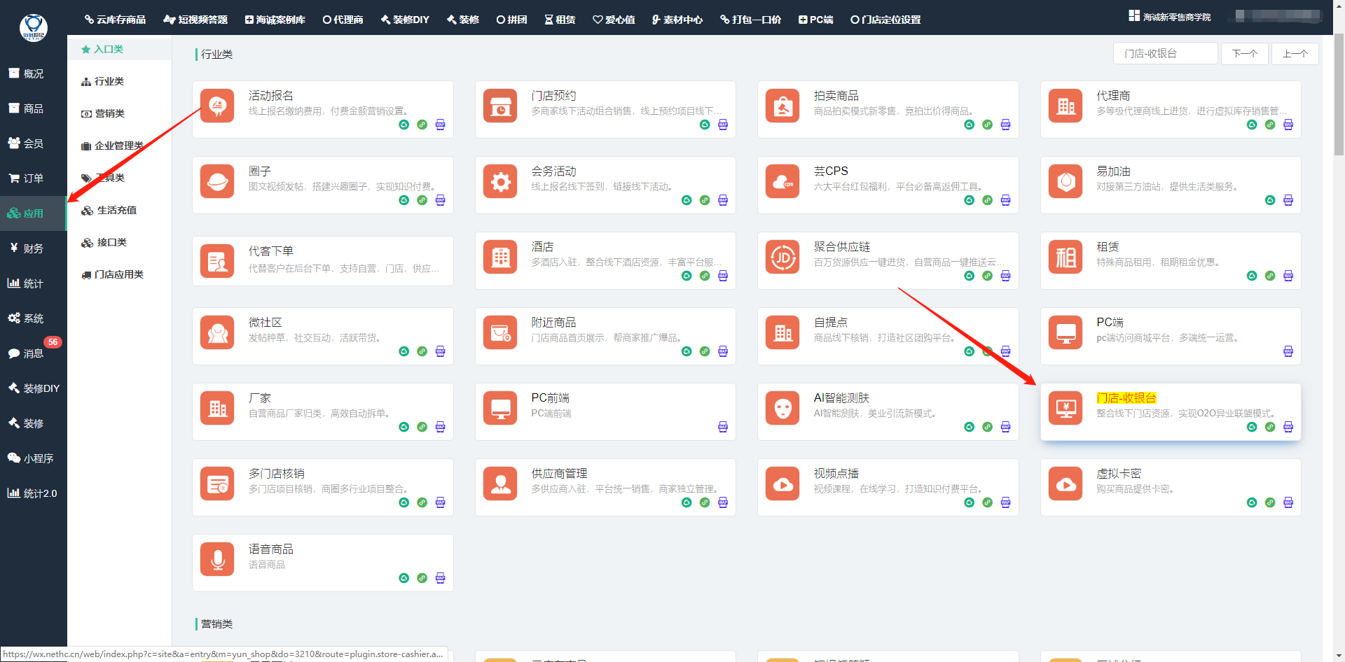 ## 1、先使用“**总平台**”授权门店拓客功能给“**门店平台**”,进入应用——门店收银台功能插件。