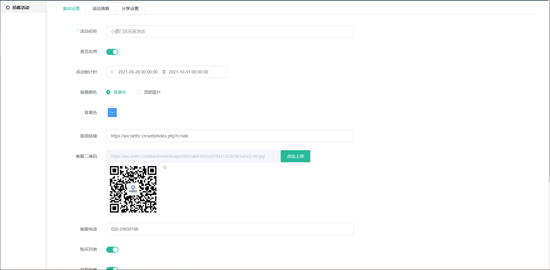 ## 7、活动创建好之后可以通过扫码或者链接的形式进入活动并转发给其他人。也可以复制活动链接。在公众号底部菜单内增加活动按钮。这样会员可以直接通过公众号菜单进入活动内。