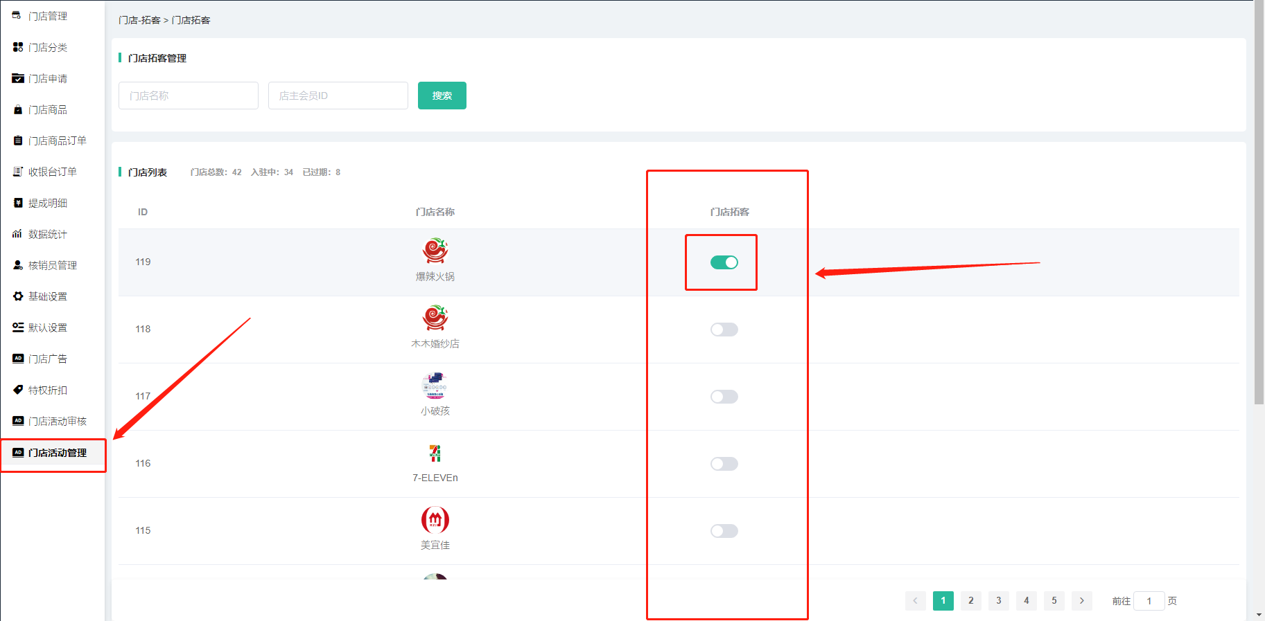 ## 2、打开“**门店活动管理**”选择需要授权的“**门店**”,开启后面的“门店拓客”按钮即可。